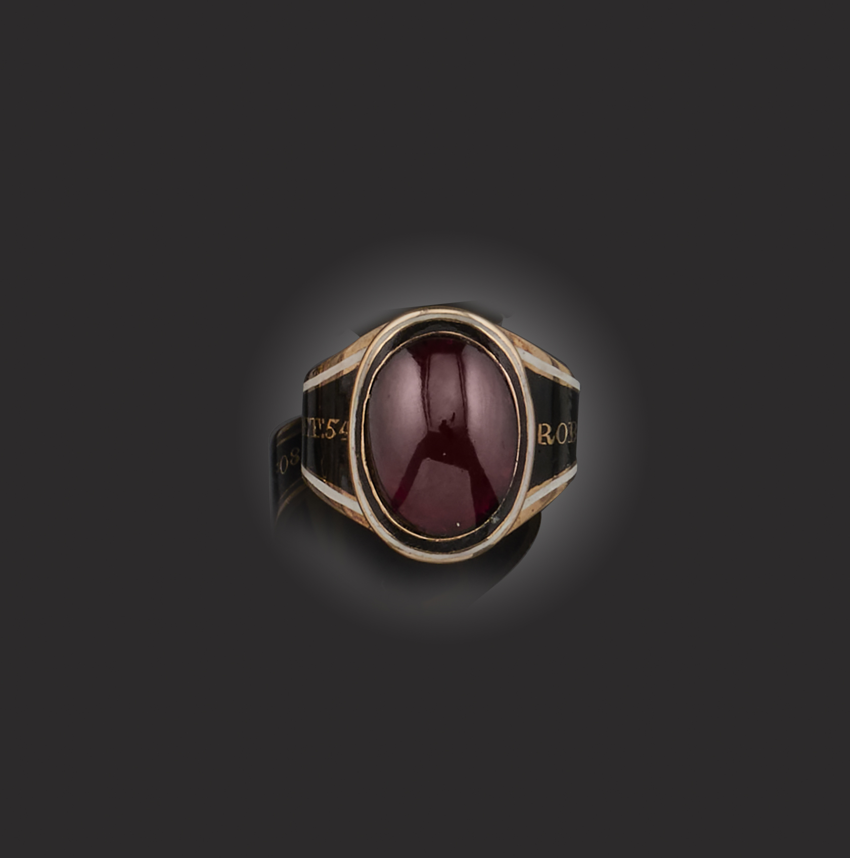 A garnet-set gold mourning ring, within white and black enamel surround on enamel band with the words Robt Young OB:3 Nov 1803 AET54, size R