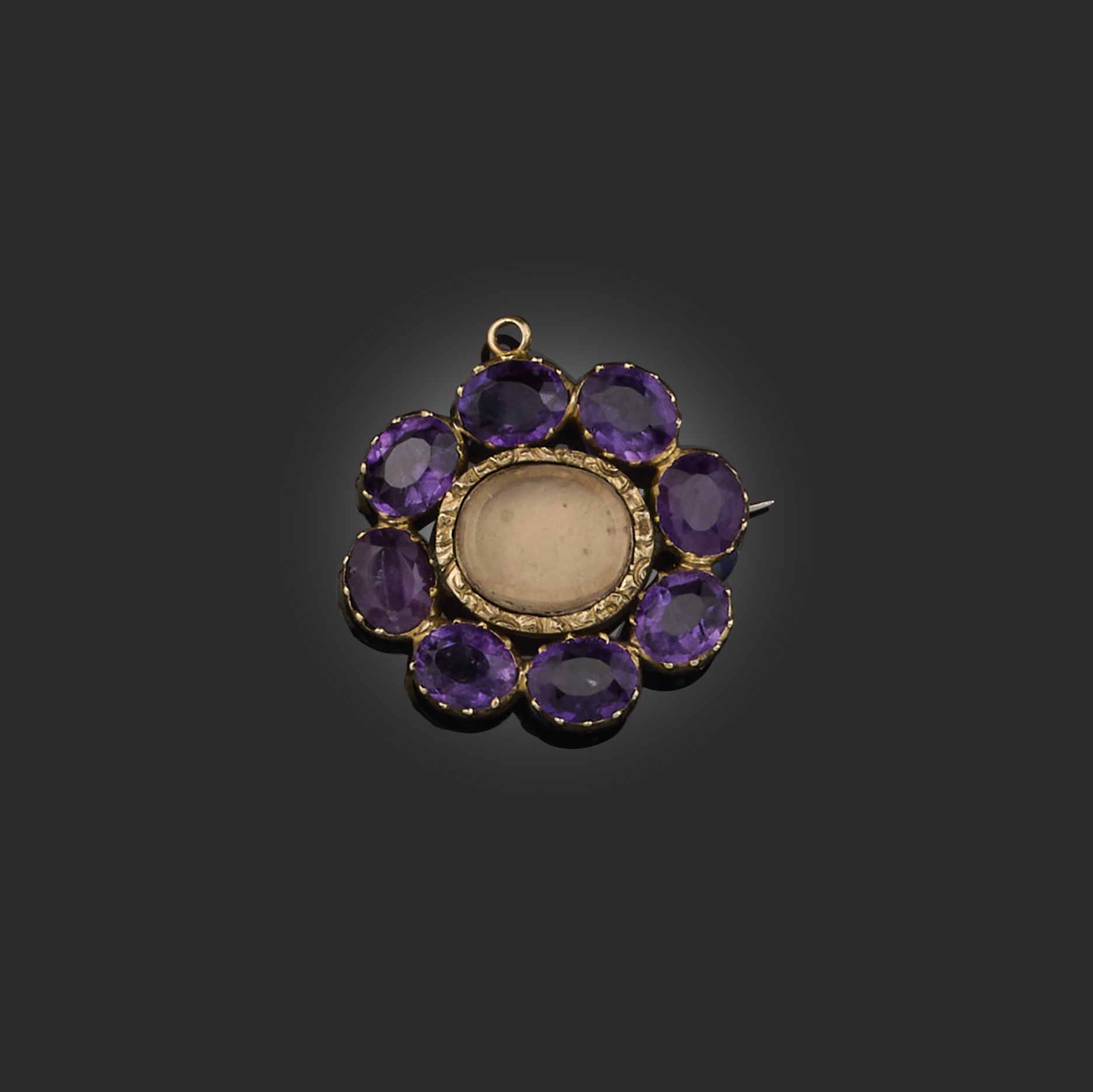 A Regency gold mourning brooch, set with amethysts surrounding a glazed locket compartment in yellow