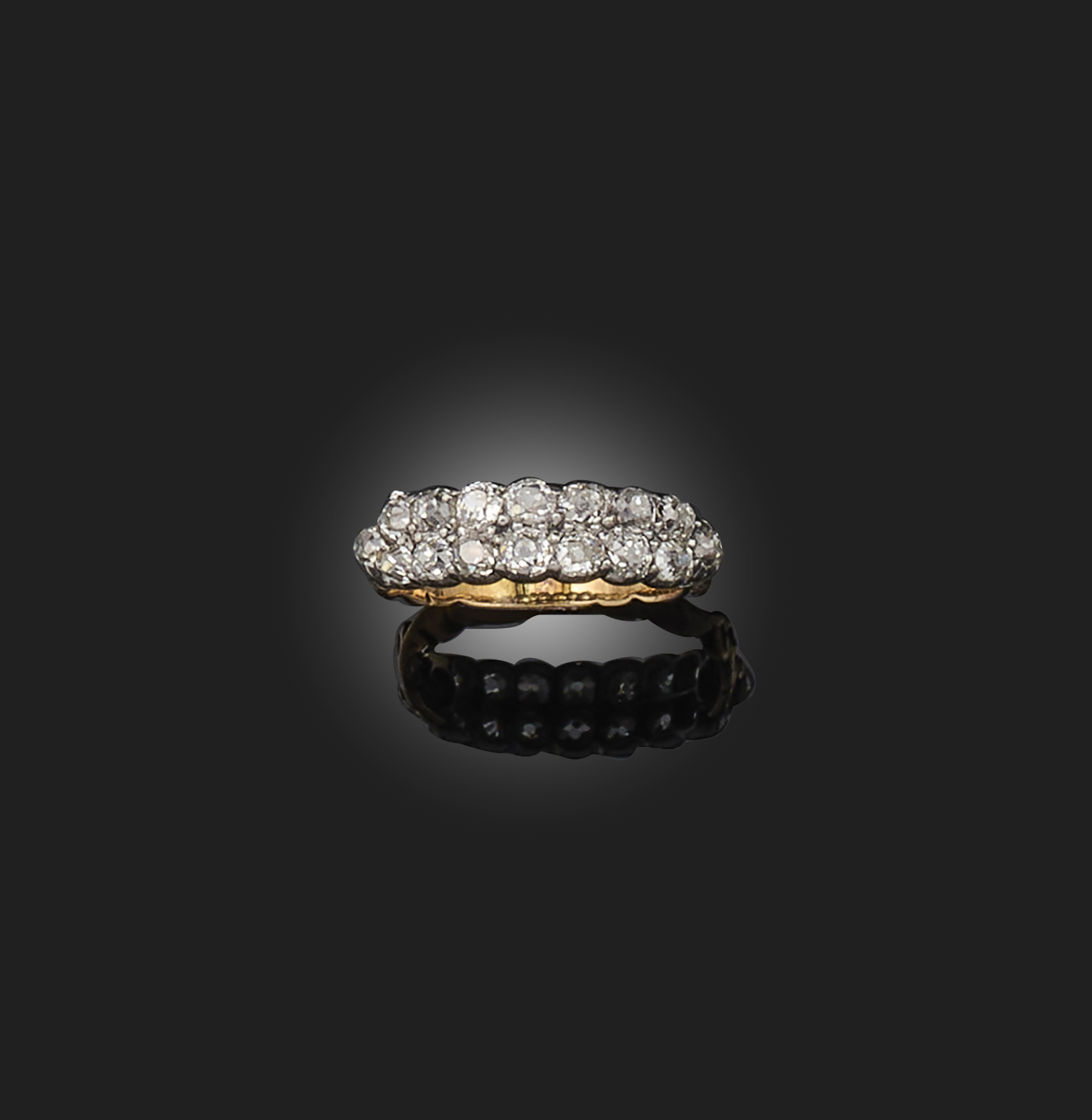 A Georgian diamond ring, early 19th century, of half-hoop design, set with two rows of cushion-shaped diamonds, mounted in silver and gold, size L