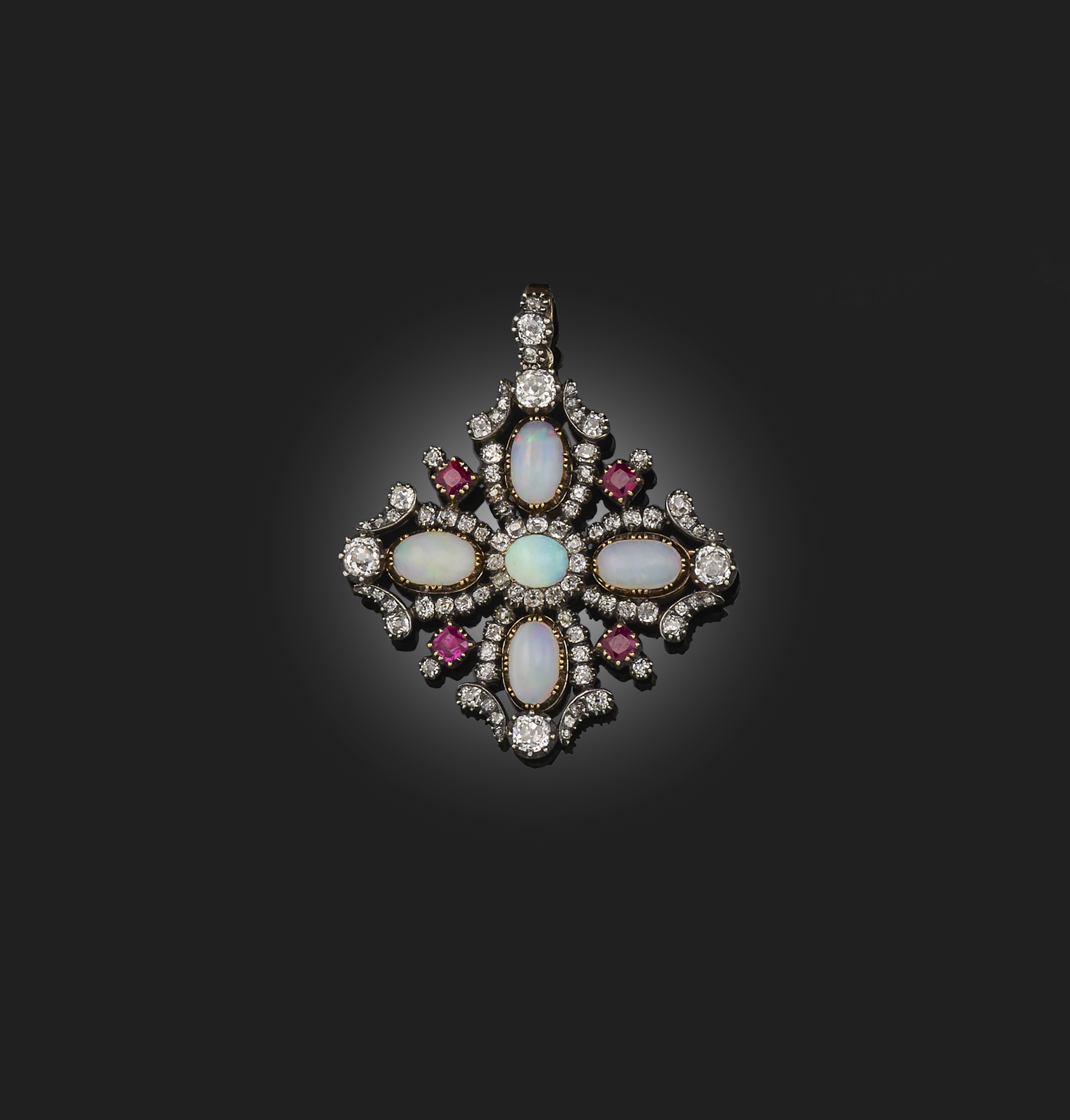 An early 19th century opal and diamond pendant, of quatrefoil design set with graduated solid white opals, old cushion-shaped diamonds and ruby accents in open and closed-back silver and gold setting, length 5cm, with remnants of brooch fittings