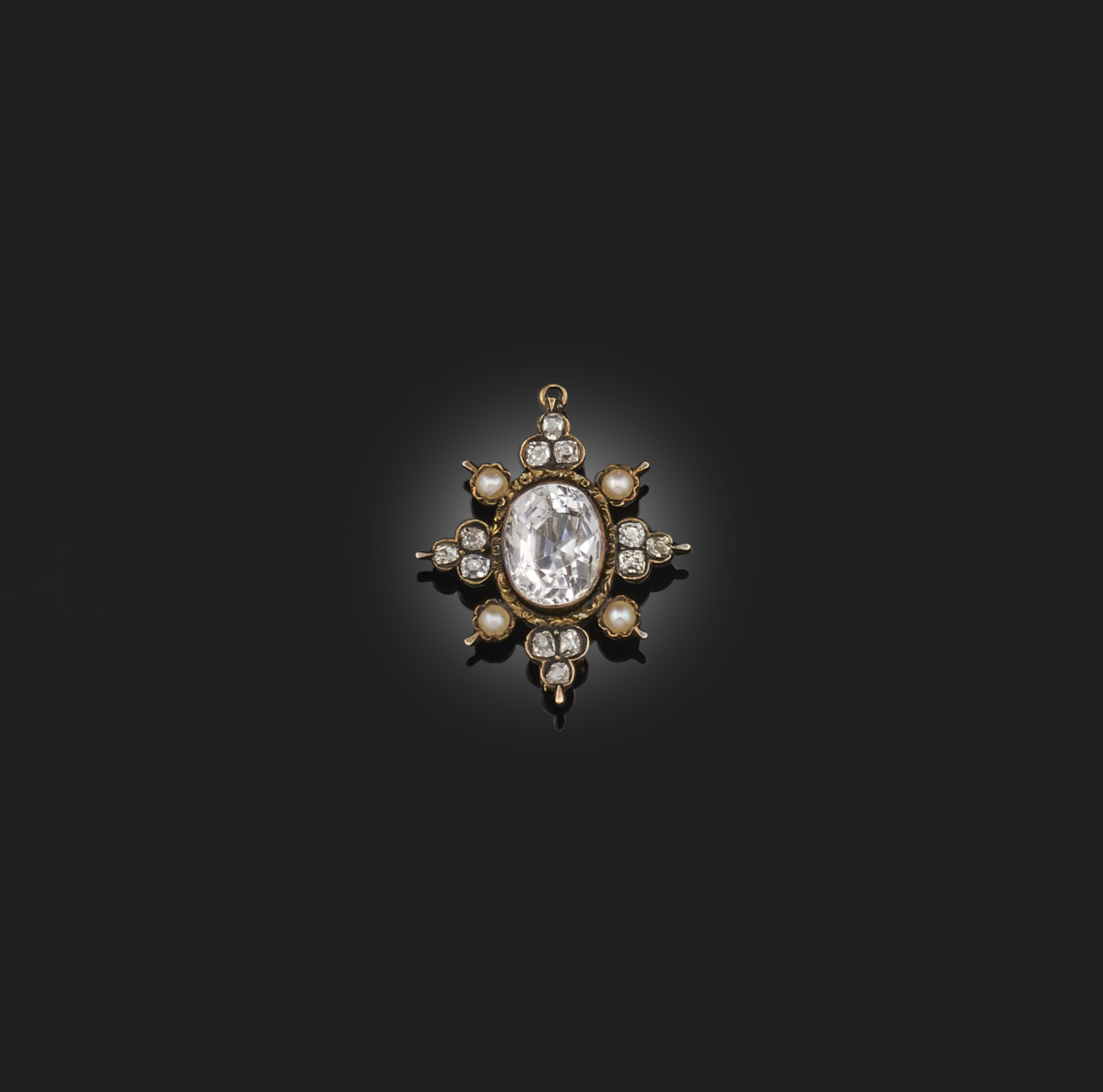 A white sapphire and diamond brooch, mid 19th century, centring on an oval white sapphire, within a radiating border of half pearls and trios of cushion-shaped diamonds, mounted in silver and gold, length 2.7cm