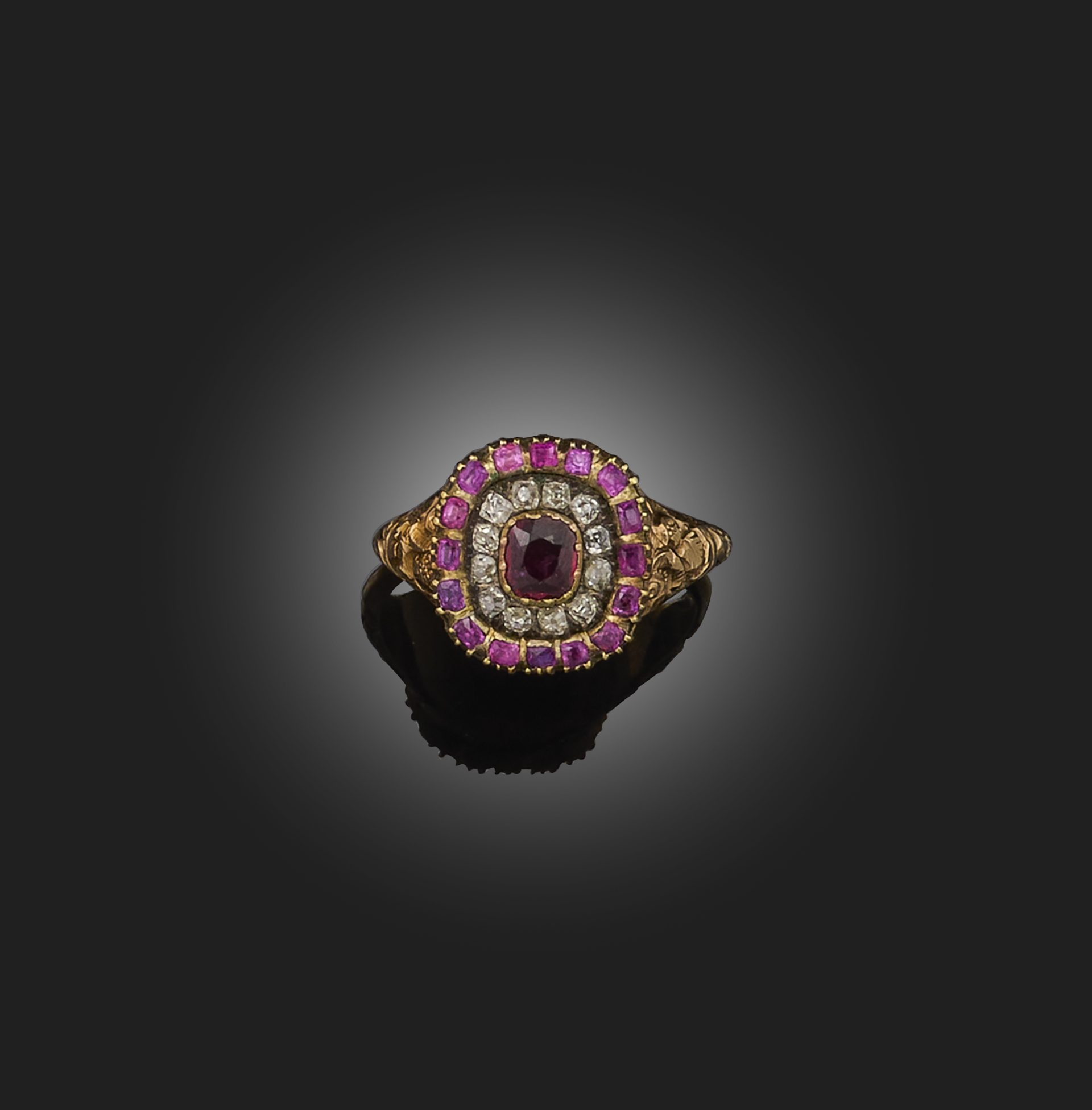 A Georgian ruby and diamond ring, early 19th century, of cluster design, centring on a cushion-shaped ruby, within concentric borders of cushion-shaped diamonds and rubies, in a closed-back setting, on a gold band with carved floral decoration to the shoulders, size X