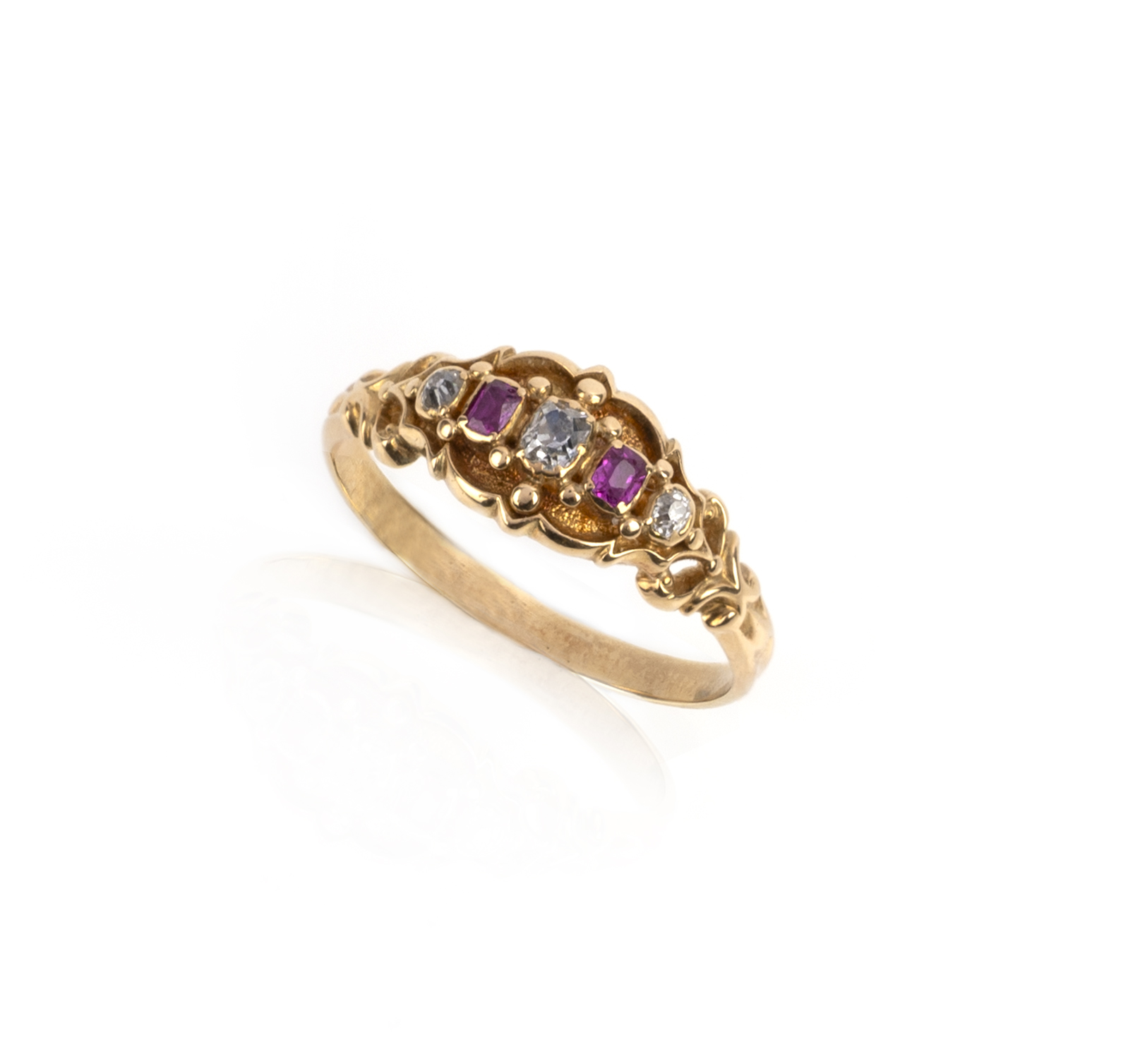 A ruby and diamond five-stone mourning ring, late 19th century, set with a sequence of cushion-shaped rubies and diamonds set in alternation, to a gold mount of scrolled design with a glazed compartment, size O