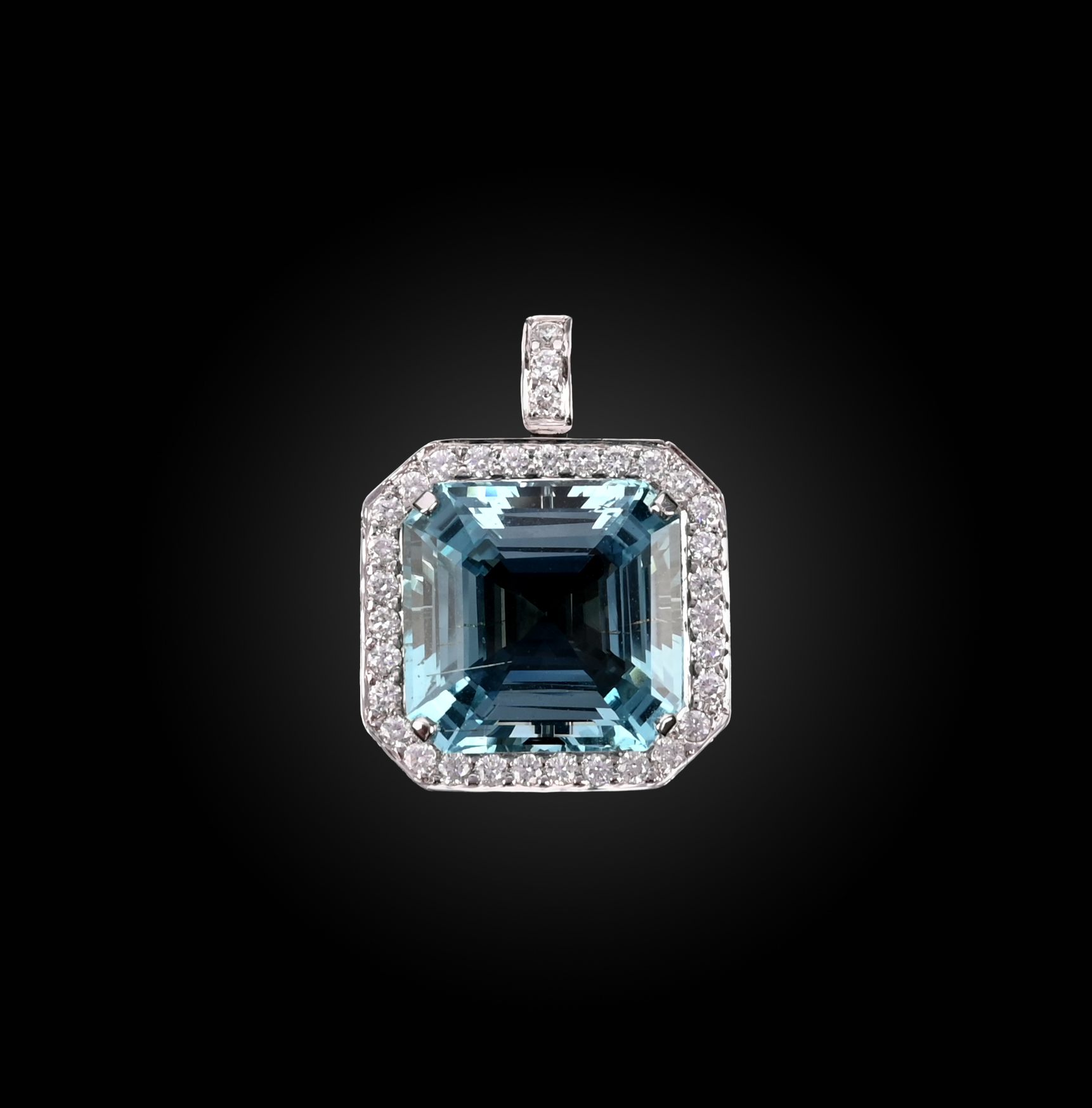An aquamarine and diamond pendant, the step-cut aquamarine weighing approximately 20.00cts, set within a surround of diamonds in white gold, length 3.1cm