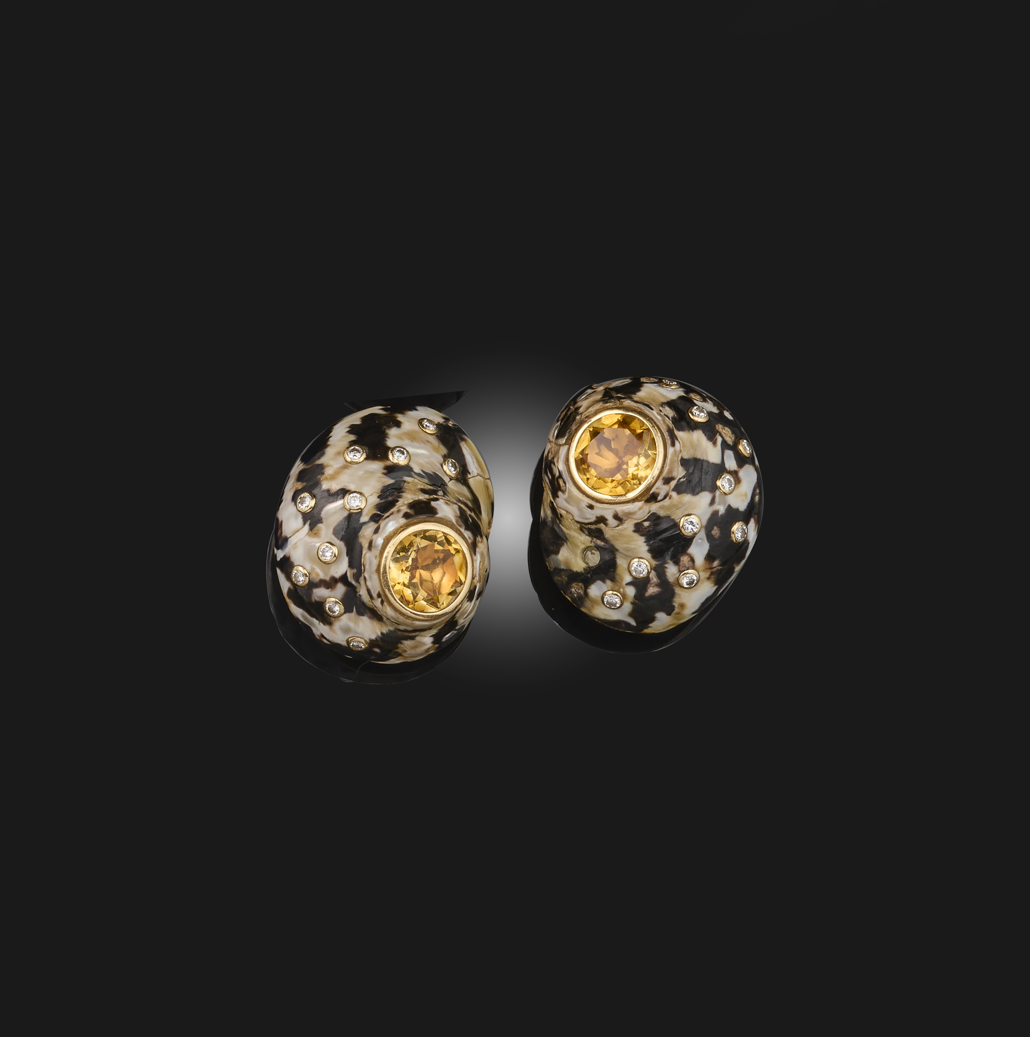 A pair of shell, citrine and diamond ear clips, each composed of a seashell set with a circular-cut