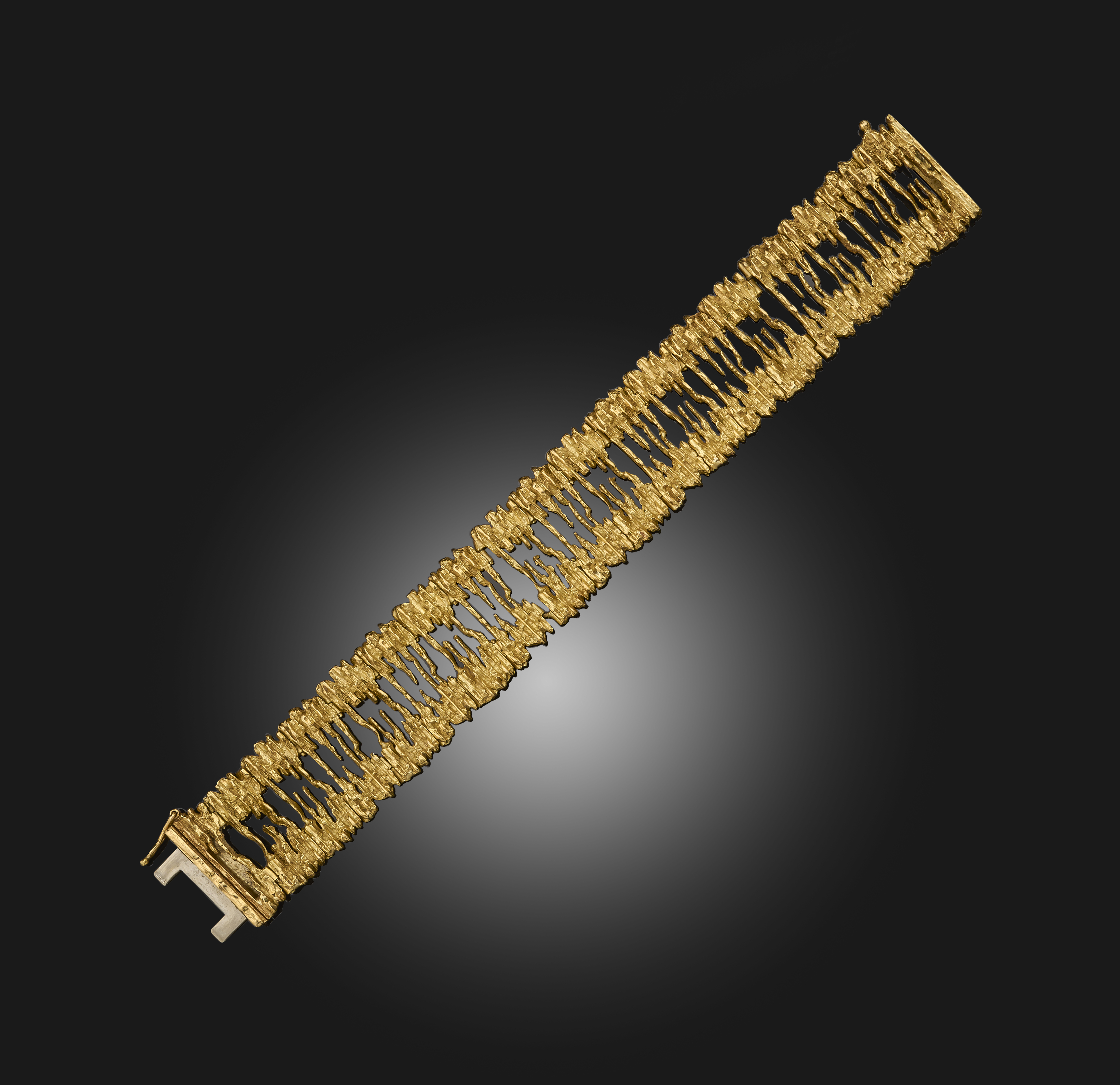Φ Alan Gard, a gold bracelet, circa 1969, composed of textured gold links, length 18.8cm, British hallmarks for 18ct gold, date letter O for 1969, sponsor's mark AMG for Alan Martin Gard, gross weight 81.4 grams