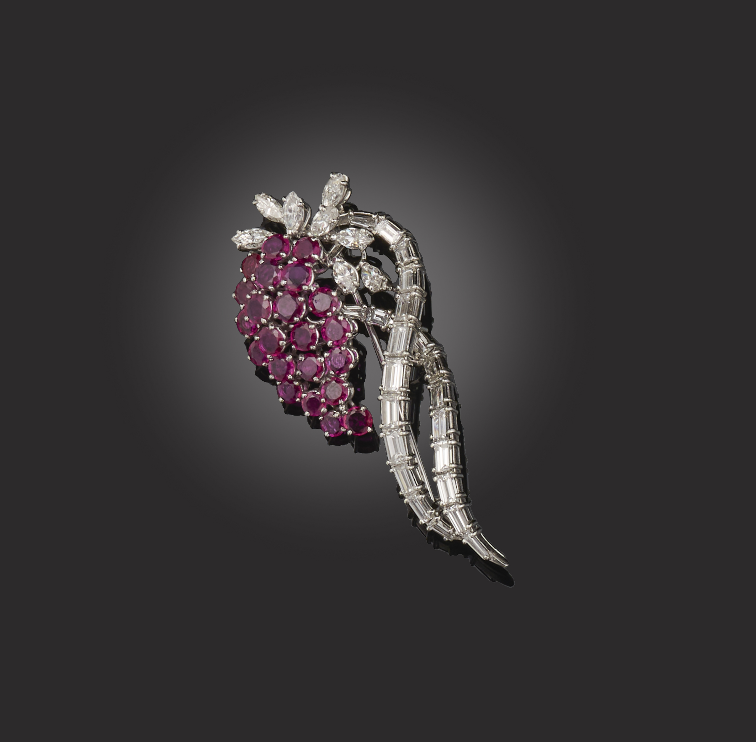 A ruby and diamond brooch, designed as fruiting vines set with graduated circular-cut rubies, on