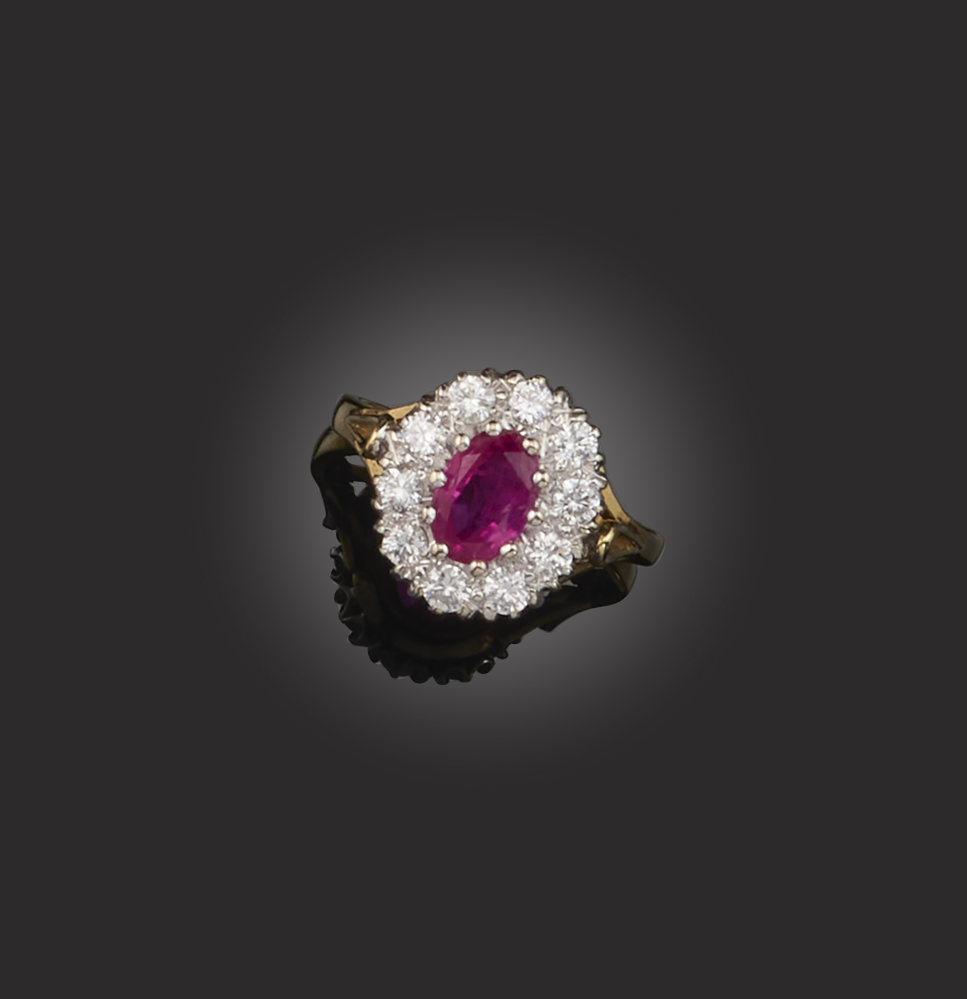 A ruby and diamond cluster ring, set with a central oval-shaped ruby within a surround of round