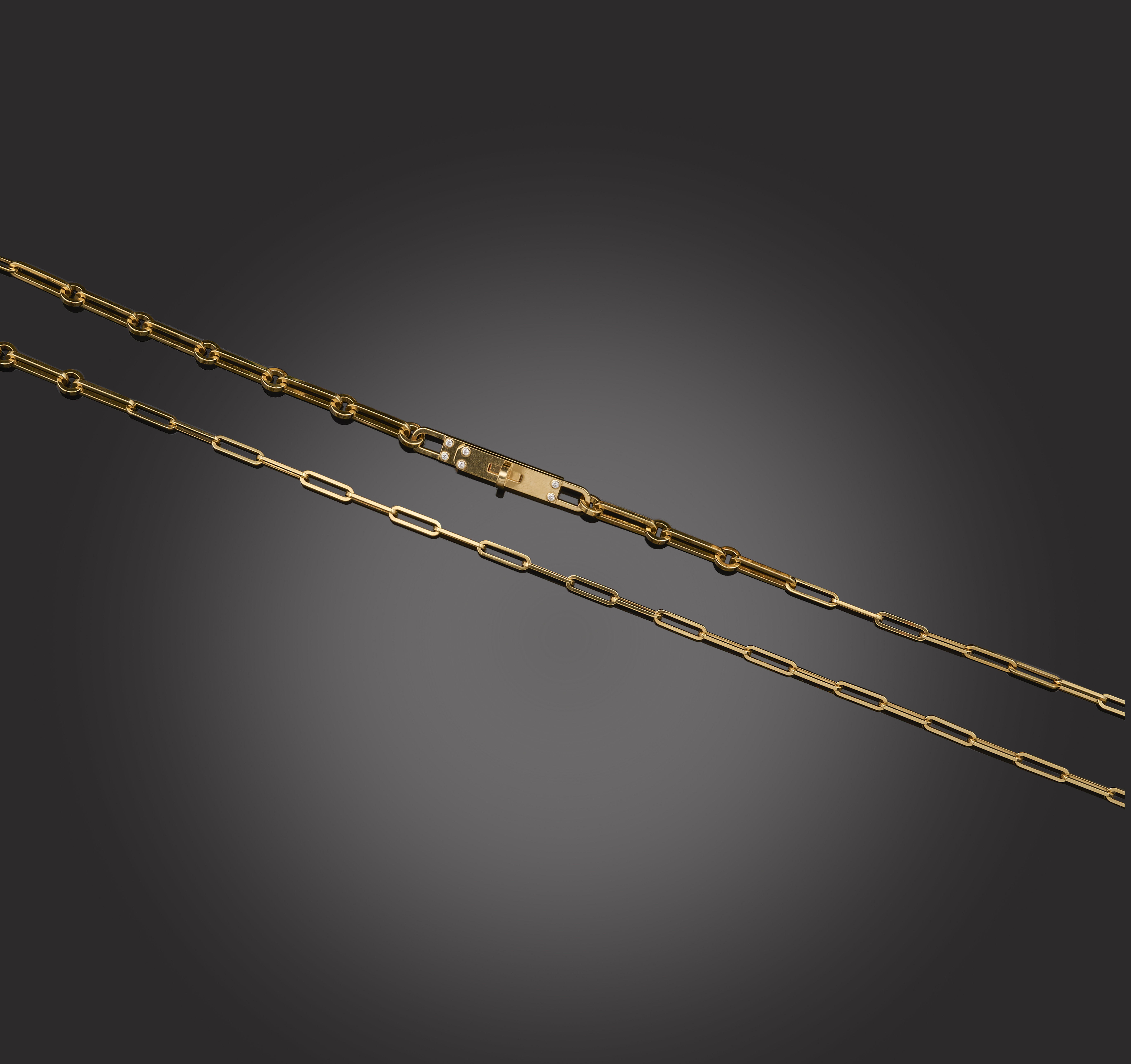 Hermès, a gold and diamond necklace, 'Collier Double Tour Kelly', designed as a longchain composed of graduated elongated links, to a a gold twist-action 'Kelly' clasp set with brilliant-cut diamonds, length 92.5cm, signed Hermès, numbered 18V009210, French assay marks for 18ct gold, French maker's mark FM with palm tree, gross weight 41.5 grams, fitted case and outer box stamped Hermès, certificate of authenticity and facsimile of original invoice dated 2021