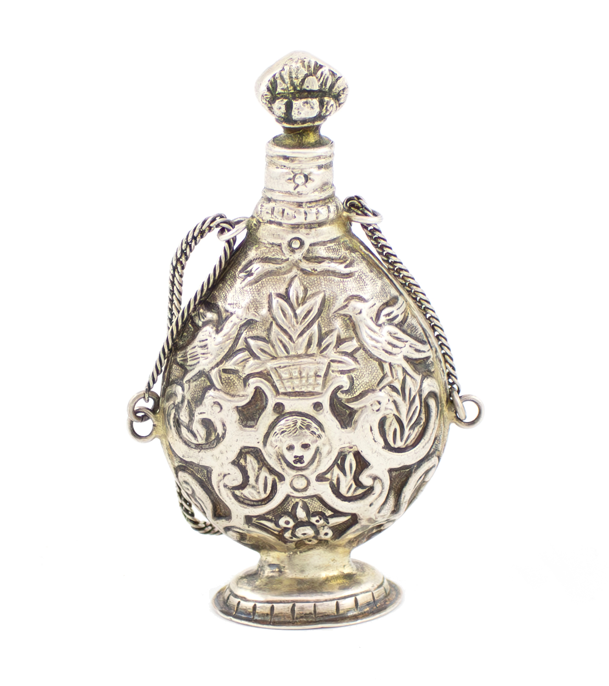 slender baluster form, embossed foliate and scroll bird decoration with a central mask, a pull-off foliate stopper, chain and ring attachments, on a raised oval foot, height 7.8cm, approx. weight 1.6oz.