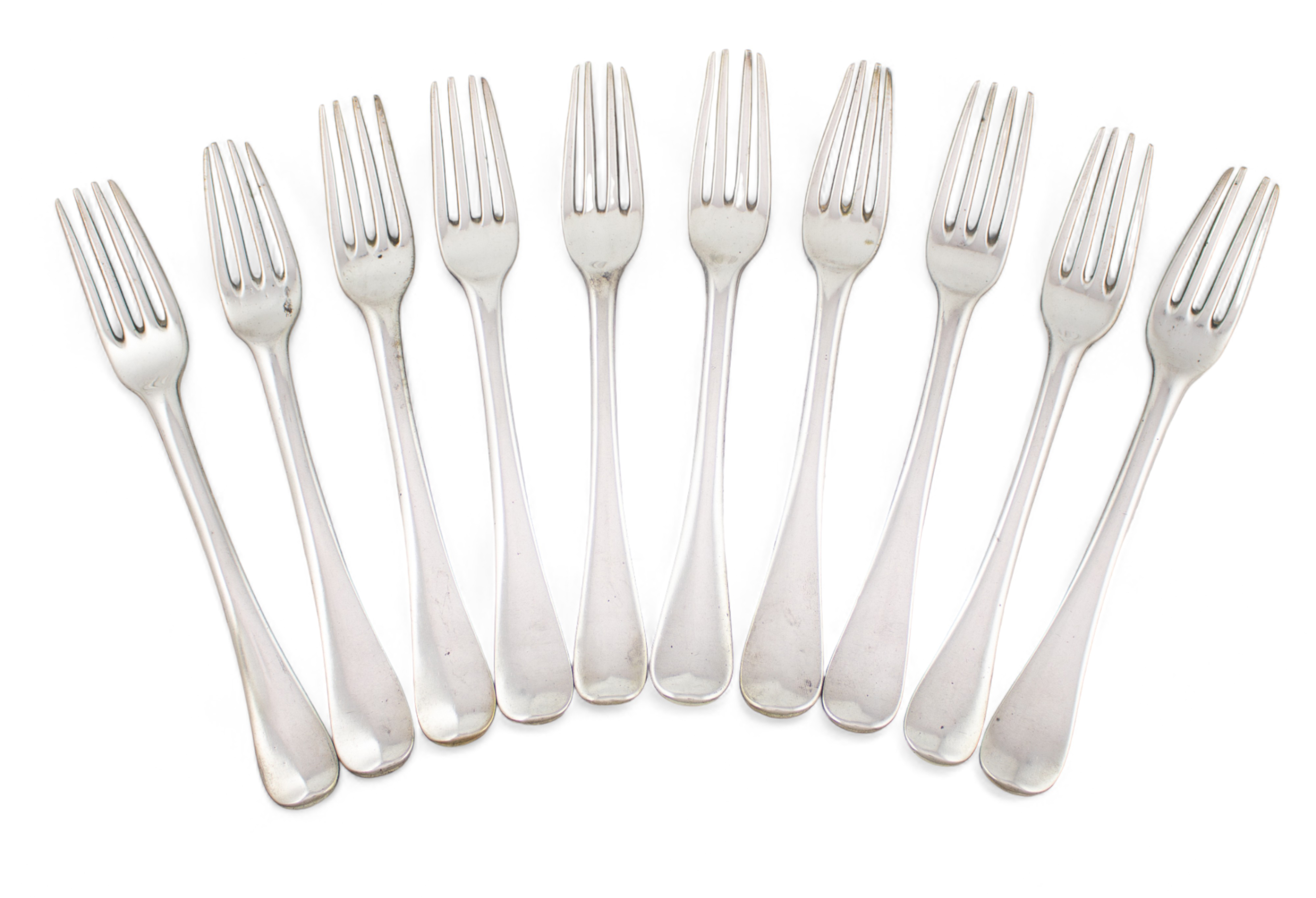 A set of ten 18th century silver Hanoverian pattern table forks,