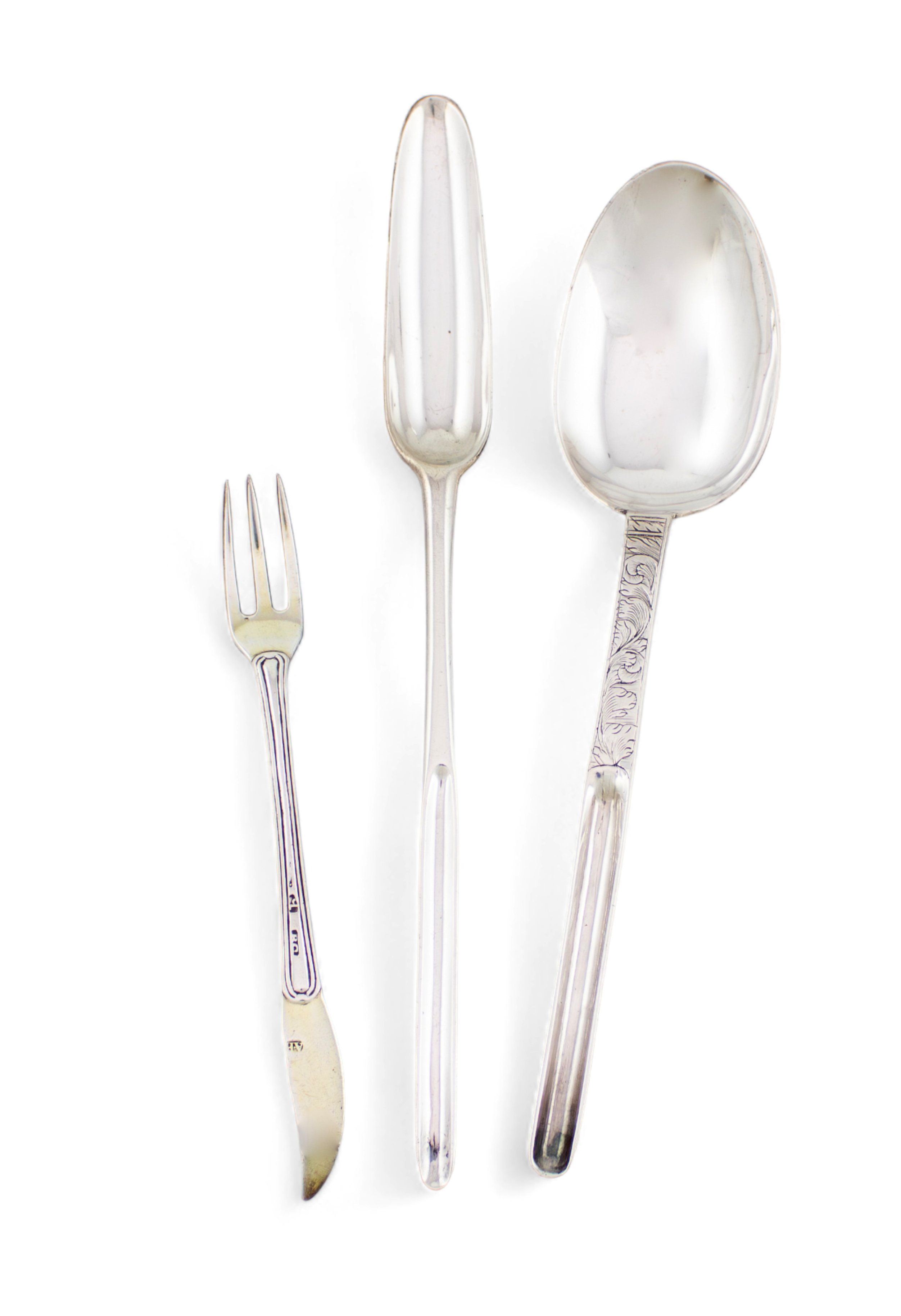 oval bowl, engraved foliate scroll decoration, length 18.8cm, plus a George III silver-gilt Thread pattern fork/knife, and a marrow scoop, London 1740, approx. total weight 2.5oz. (3)