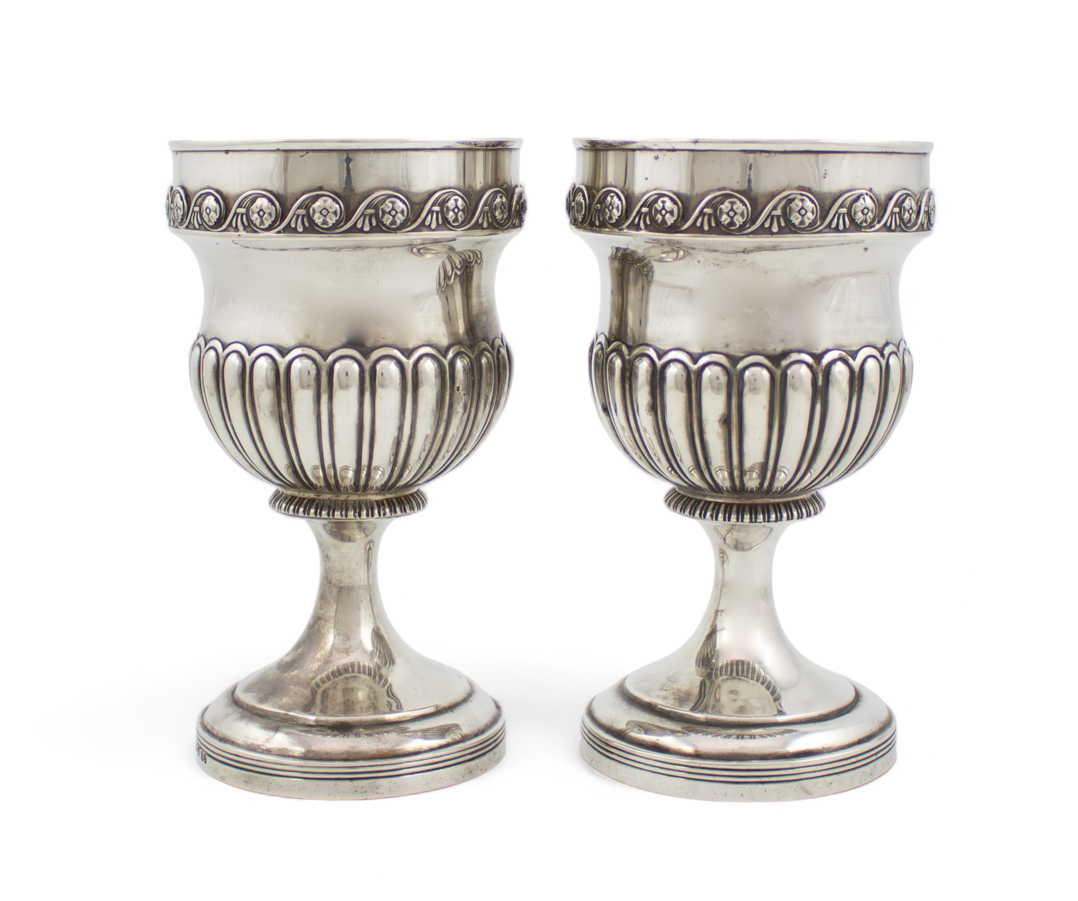 circular form, part-fluted decoration, below a scroll and medallion border, on a raised circular foot, height 18.4cm, approx. weight 25oz. (2)