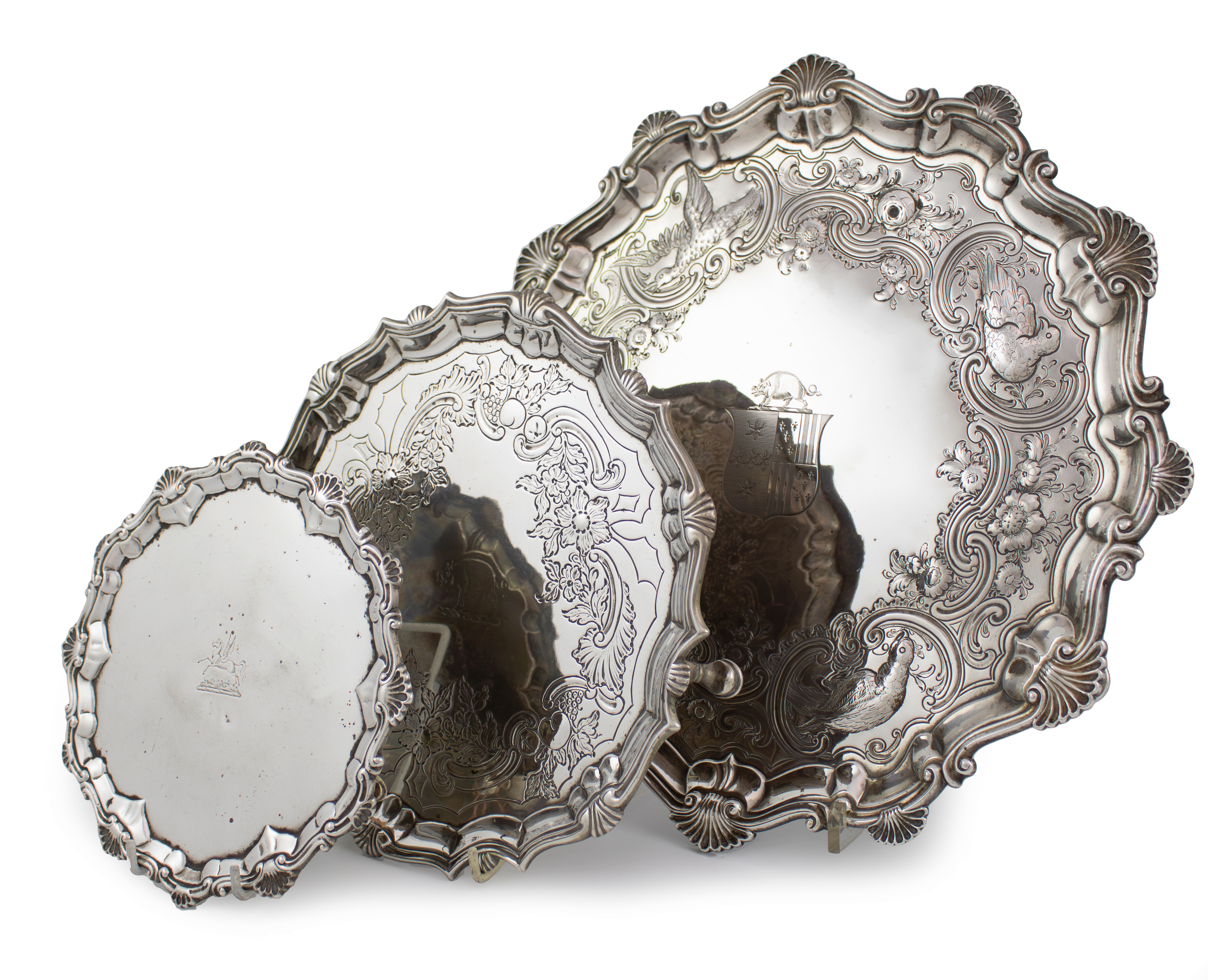 circular form, later embossed foliate scroll and bird decoration, shell and scroll border, engraved with an armorial shield, plus a George II small silver salver, by R. Abercrombie, London 1744, chased foliate scroll decoration, engraved with a crest, and a George II silver waiter, by Ebenezer Coker, London 1766, with a crest, diameters 32.2cm, 23.5cm and 18.5cm, approx. weight 52.9oz. (3)