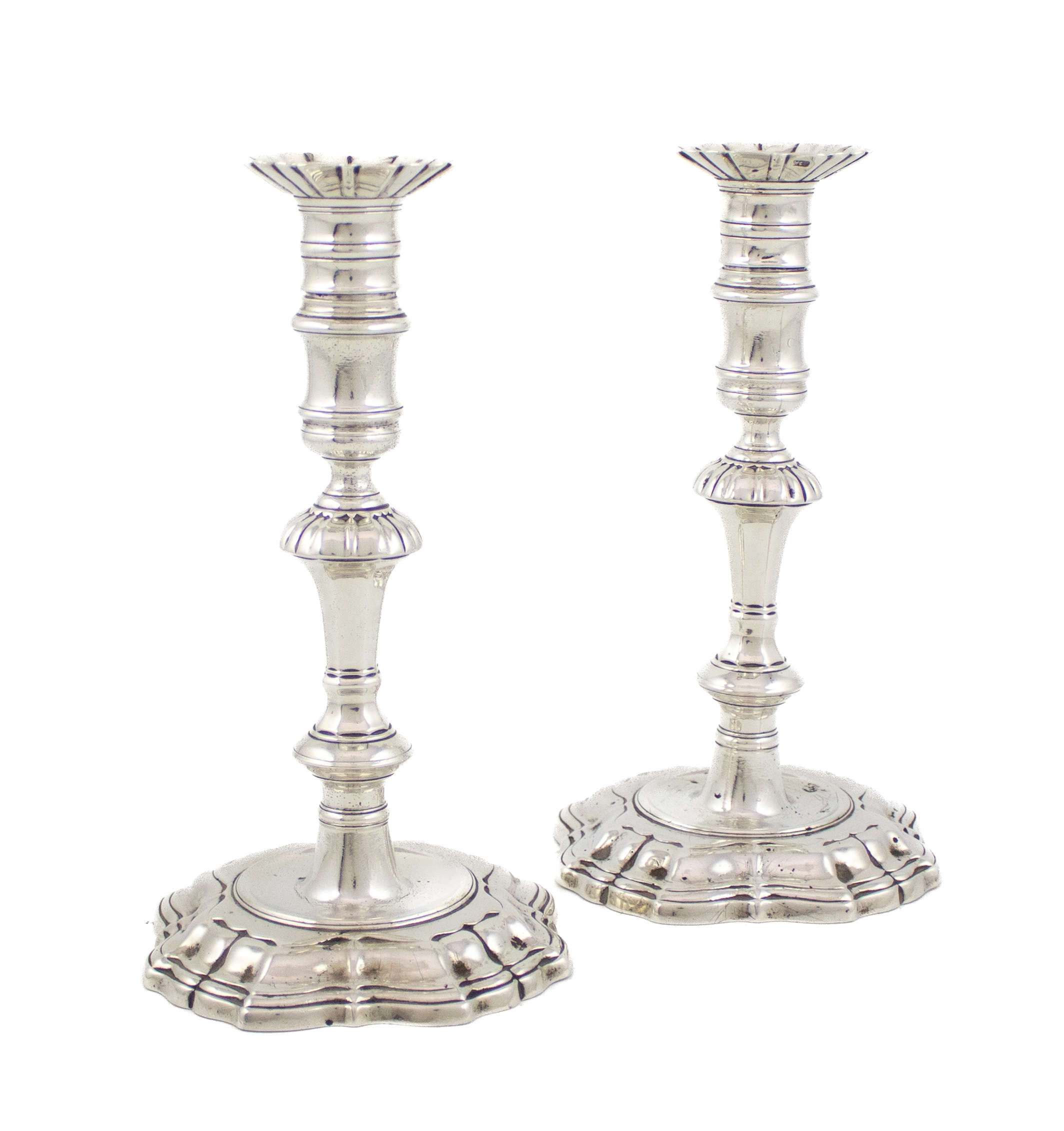 knopped stems, fluted shoulders, spool-shaped capitals, removable elongated drip pans, on raised shaped square bases, height 20.2cm, approx. weight 31.5oz. (2)