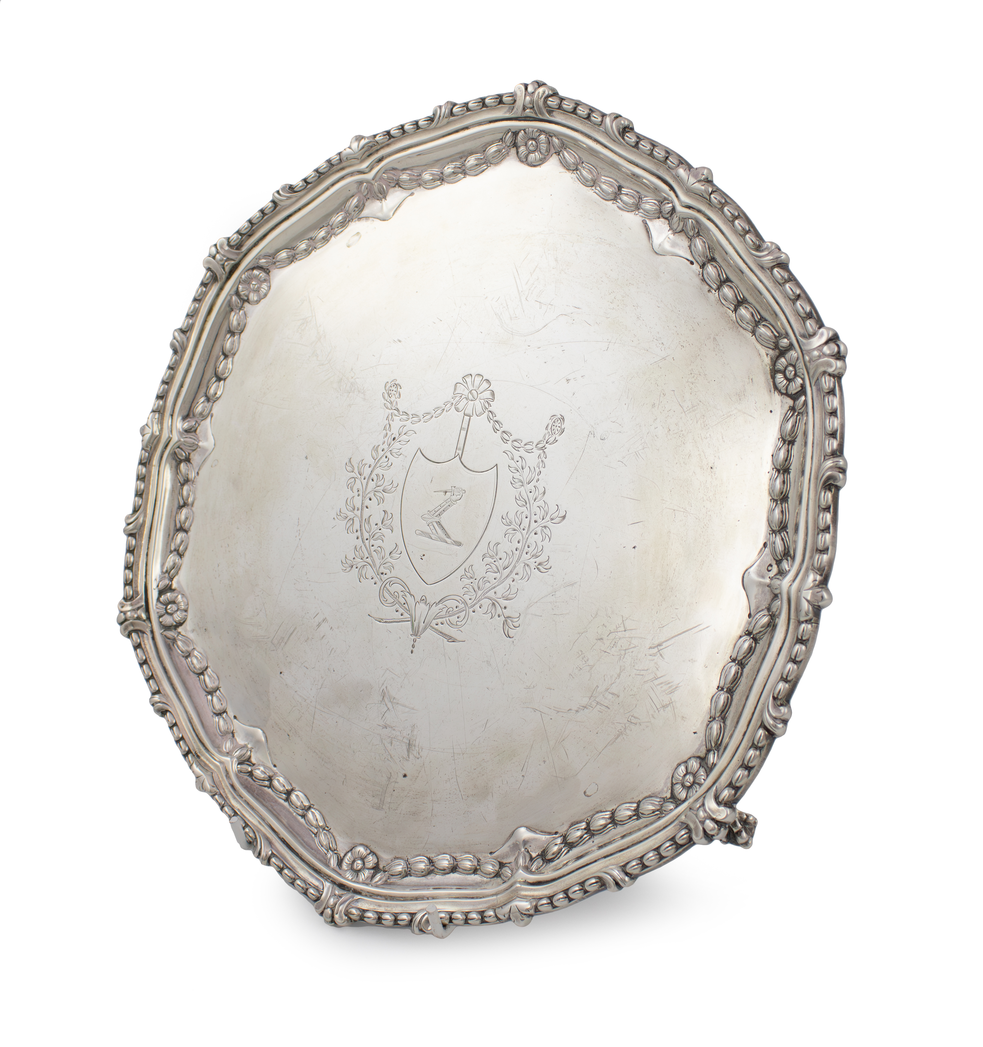 circular form with a floral garland border, central engraved shield surrounded by foliate decoration, a presentation inscription to the underside, on three claw and ball feet, diameter 27.2cm, approx. weight 18.4oz.