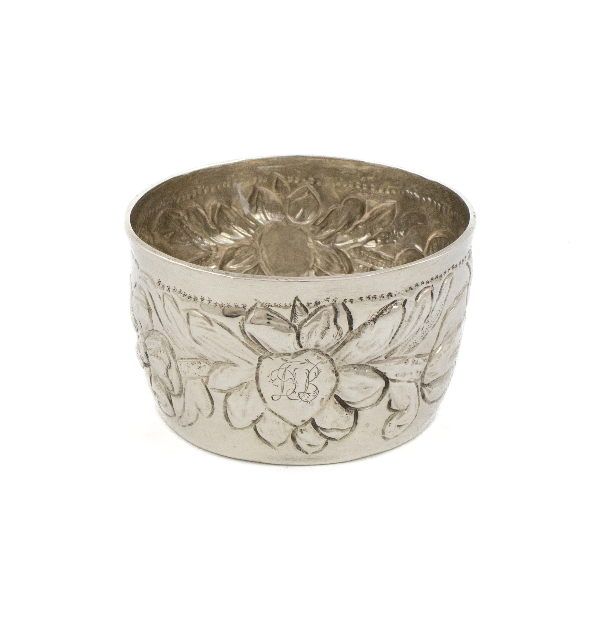 circular form, embossed foliate decoration, later initials, the underside scratch initialled 'W' over 'M', height 5.2cm, approx. weight 2.8oz.