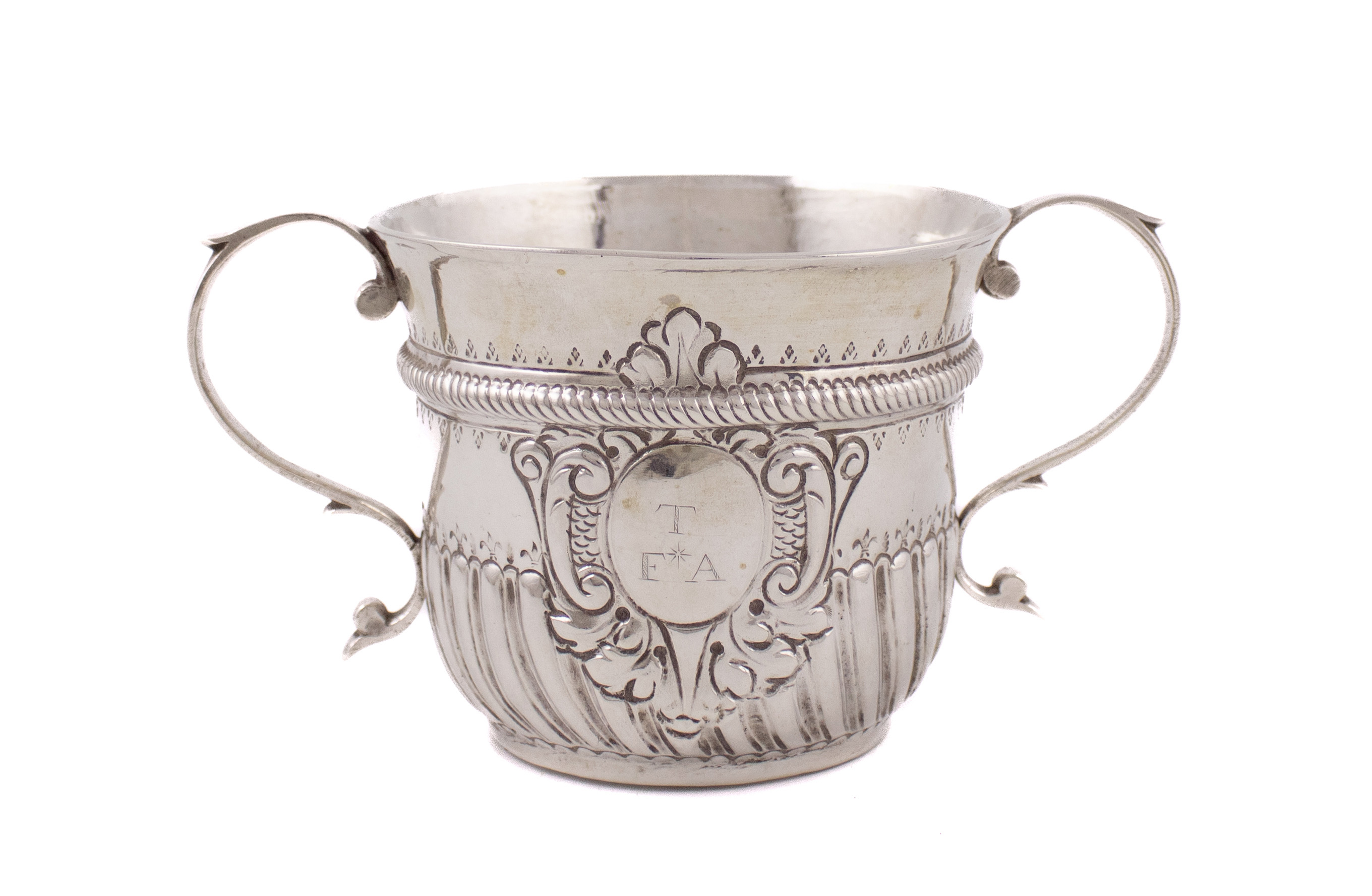 circular form, part-fluted decoration, a gadrooned band with a central scroll cartouche, scratched initials 'T' over 'F.A', scroll handles, length handle to handle 17.4cm, approx. weight 7.8oz.