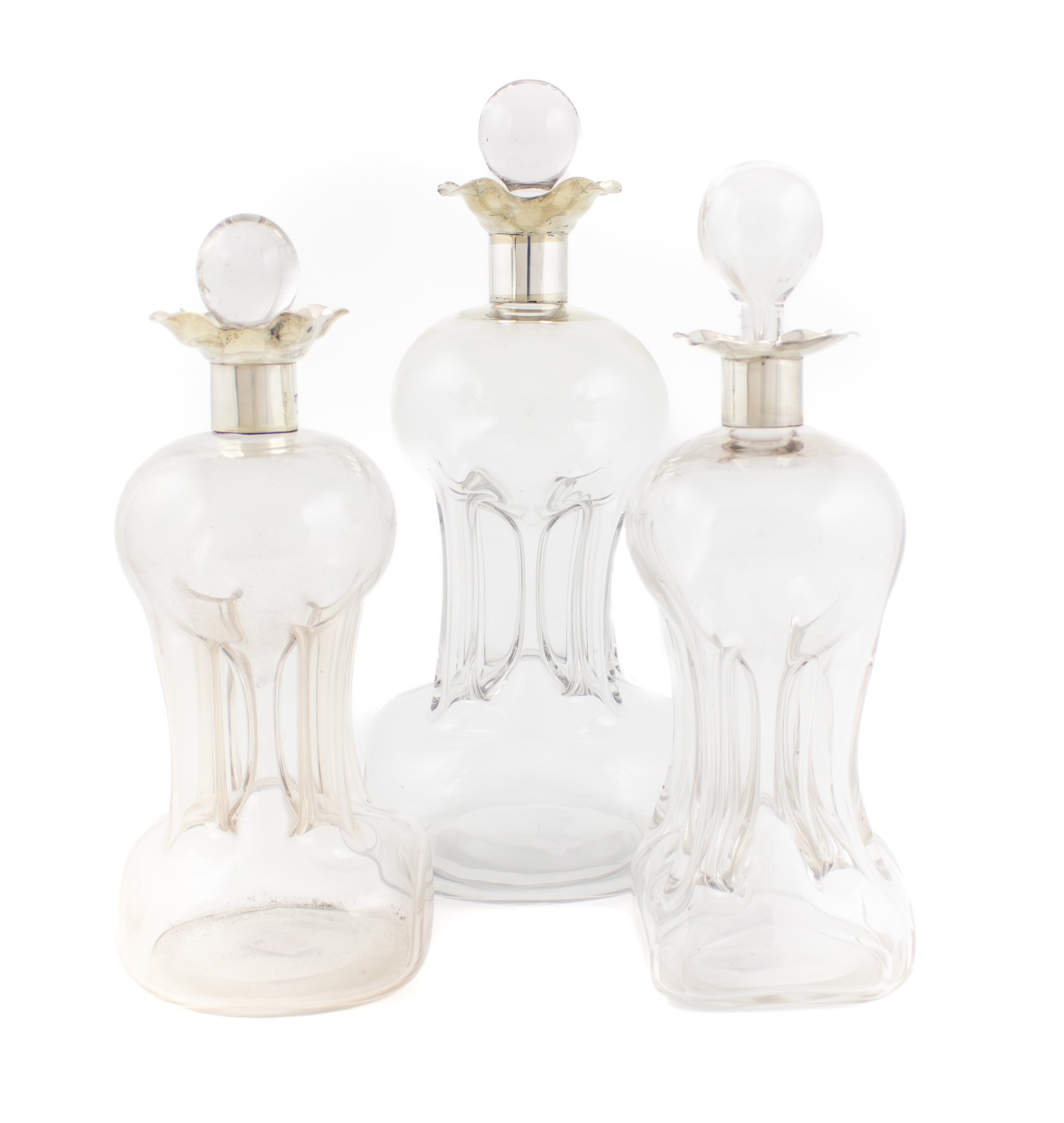by William Hutton and Sons, Birmingham 1928, hour-glass form, plain mount, plus two smaller similar decanters, one by the same maker, Sheffield 1901, and one by Mappin and Webb, Birmingham 1910, height of tallest 29cm. (3)