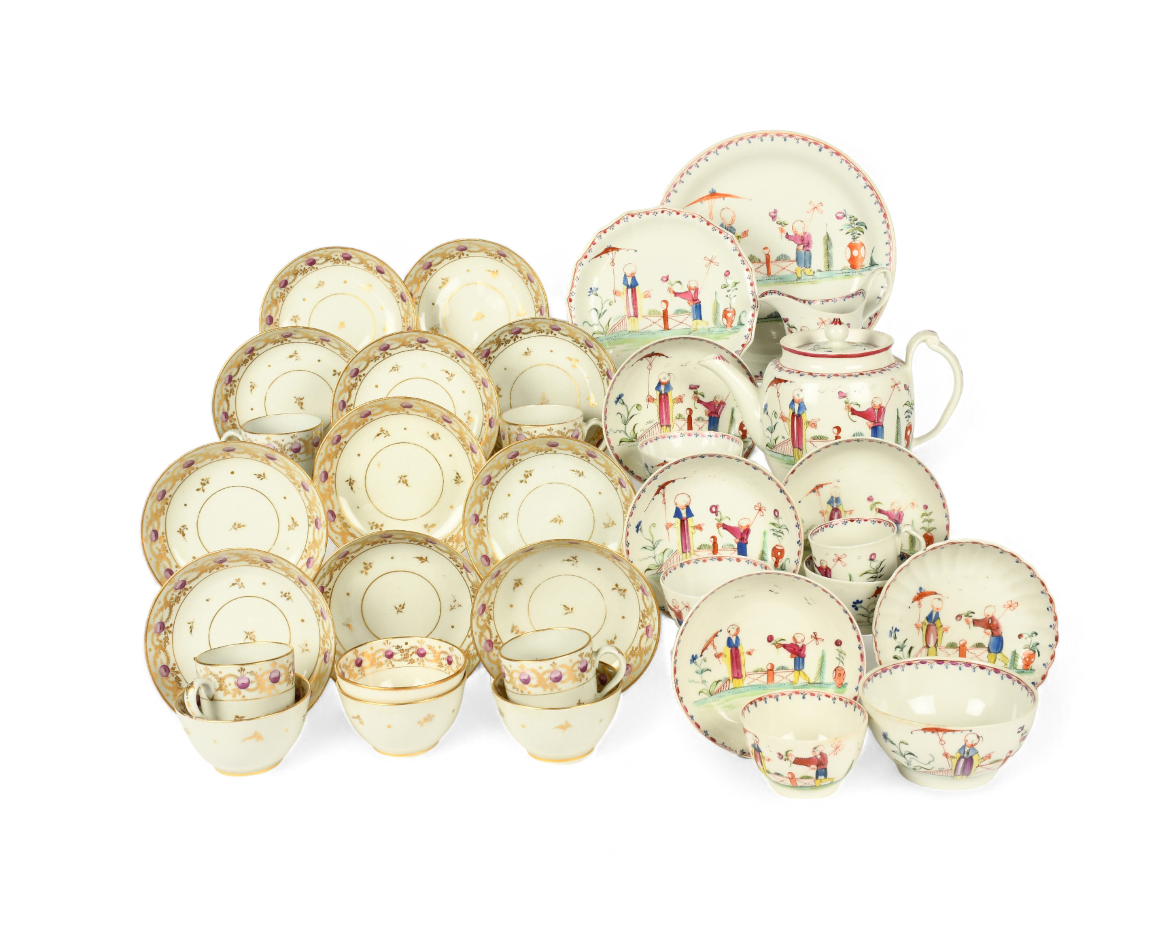 A New Hall part tea service, c.1785, painted in pattern 20 with Chinese figures in a garden setting. Comprising: a teapot with cover and stand, a milk jug, a cake plate, a slop bowl, a coffee cup, four teabowls and five saucers. Together with another New Hall part service decorated with a lilac and gilt border, comprising four coffee cups, four teabowls and 11 saucers. (35)