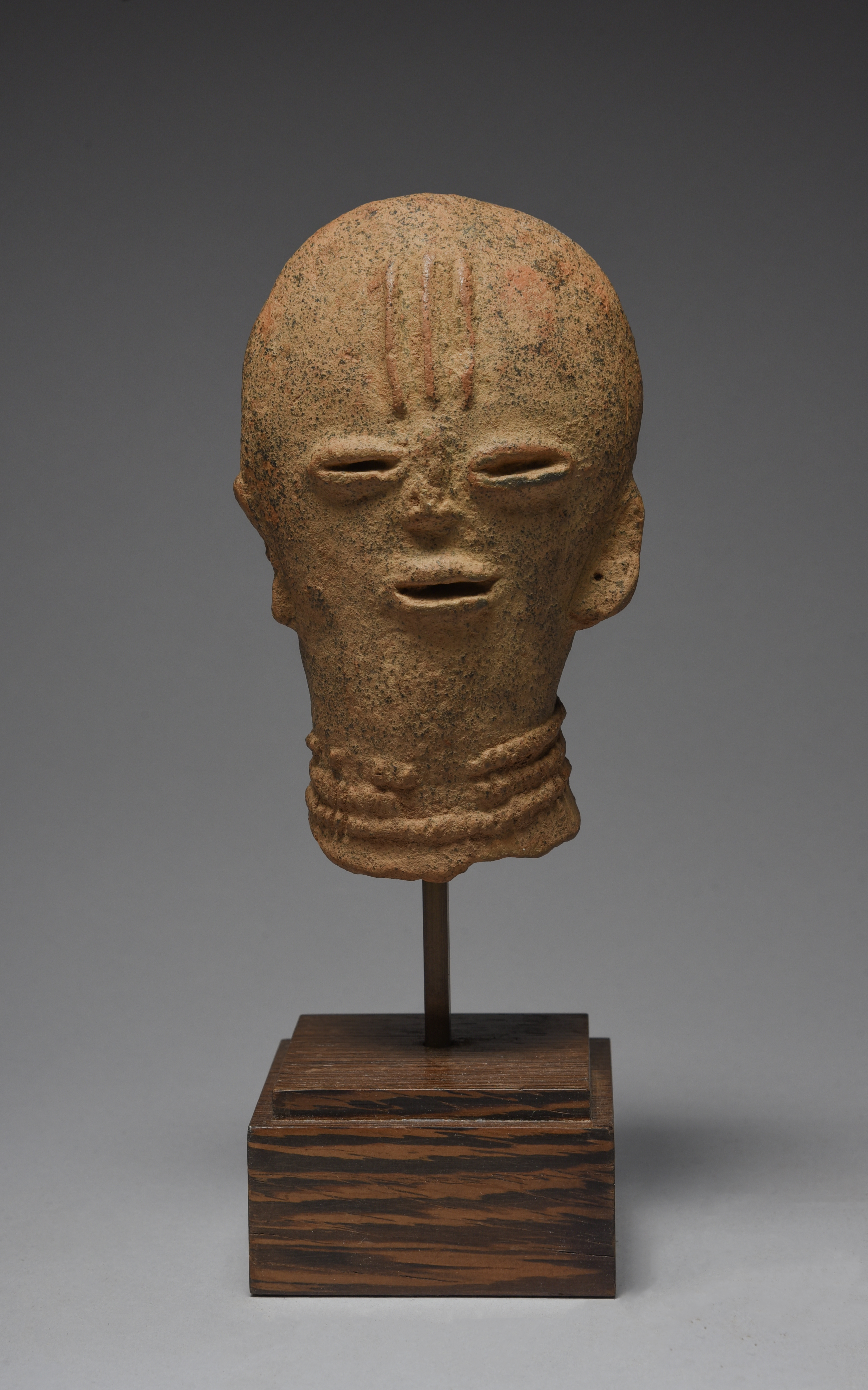 terracotta, with three relief scarification lines to the forehead, a ribbed coiffure, slit eyes and mouth with a triple ribbed necklace,