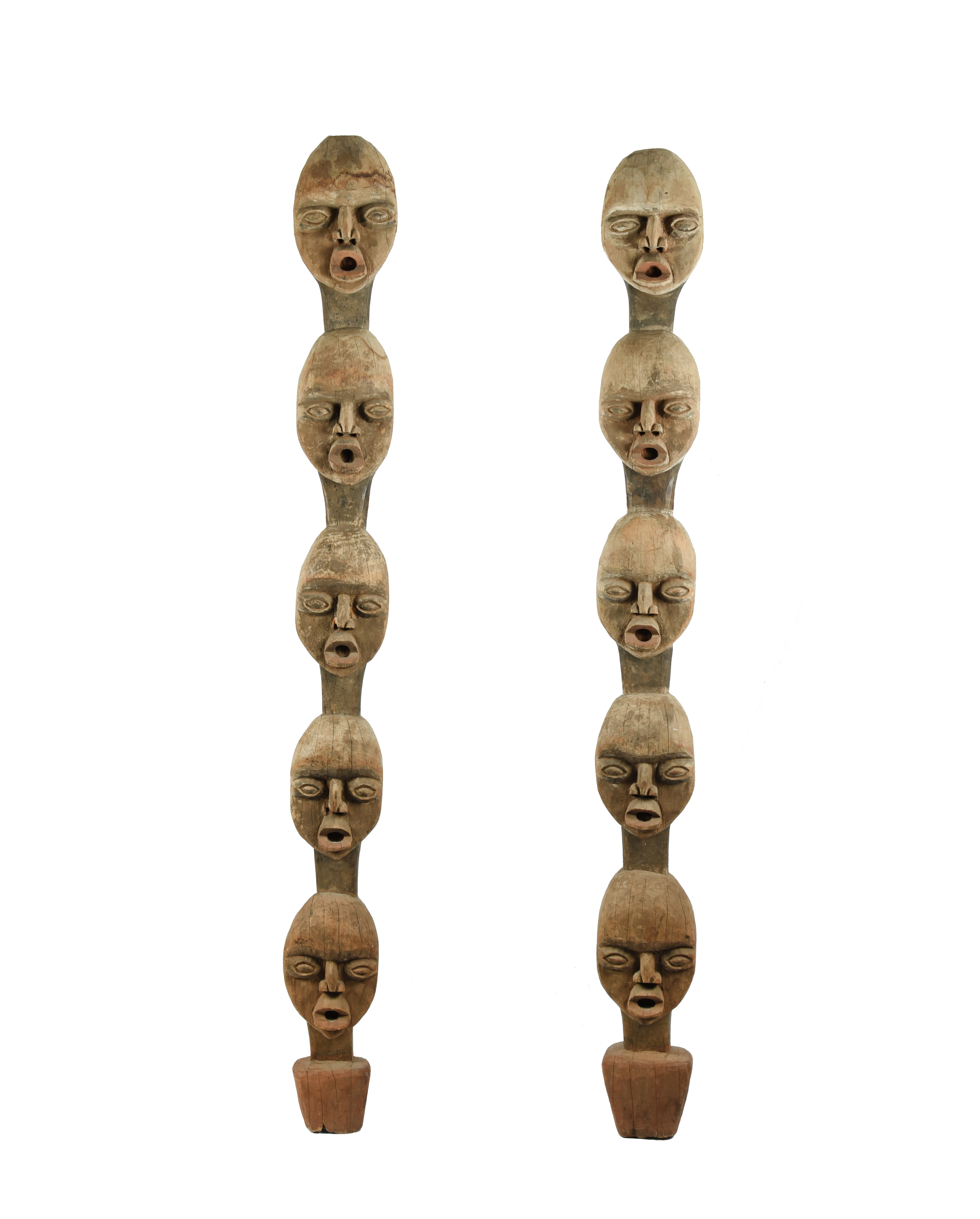 each carved with five heads having open mouths and eliptical eyes, with tapered bases and remains of black and red pigment,