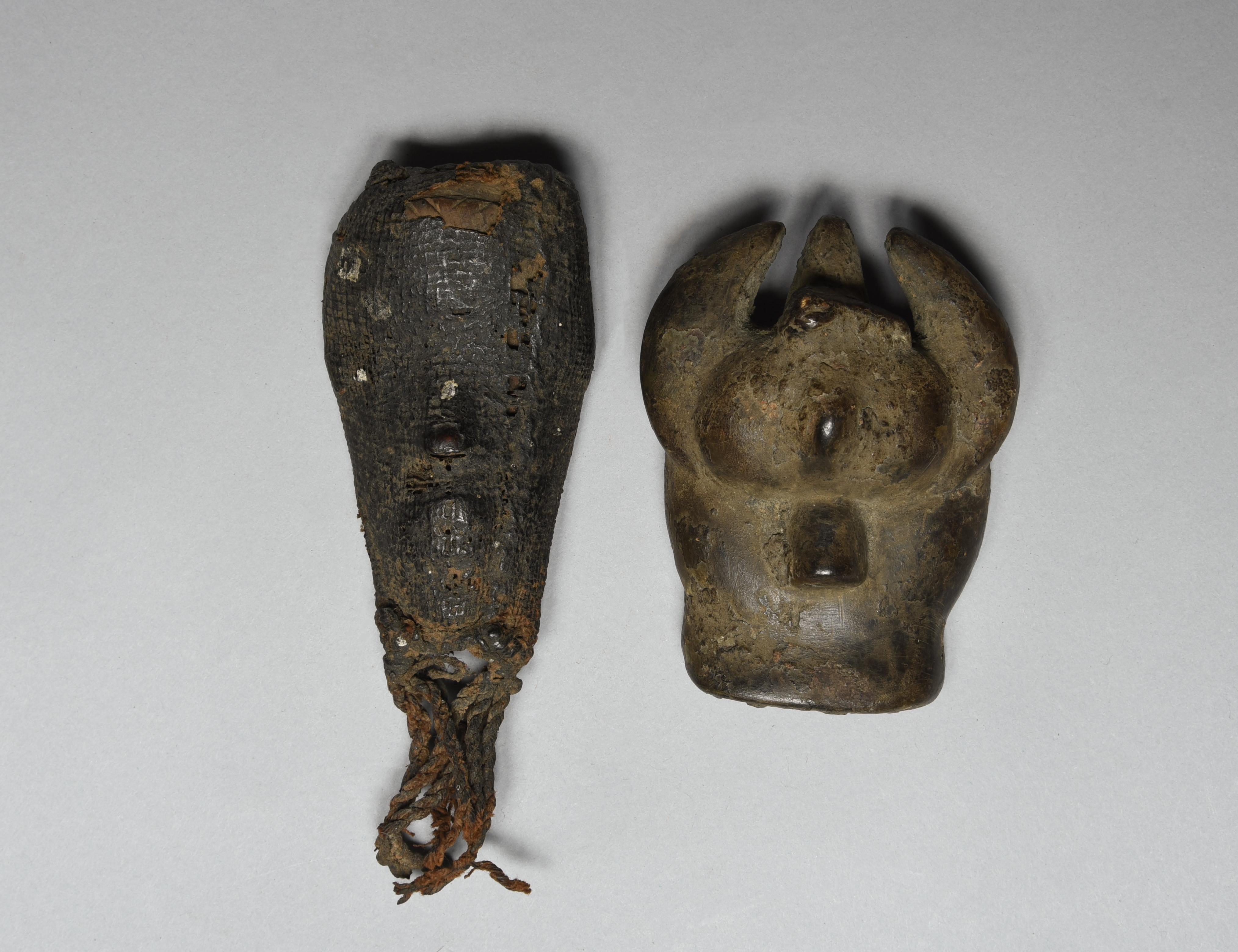 and an Ivory Coast stone/ceramic buffalo head mask, with an encrusted patina, 9.5cm high. (2)