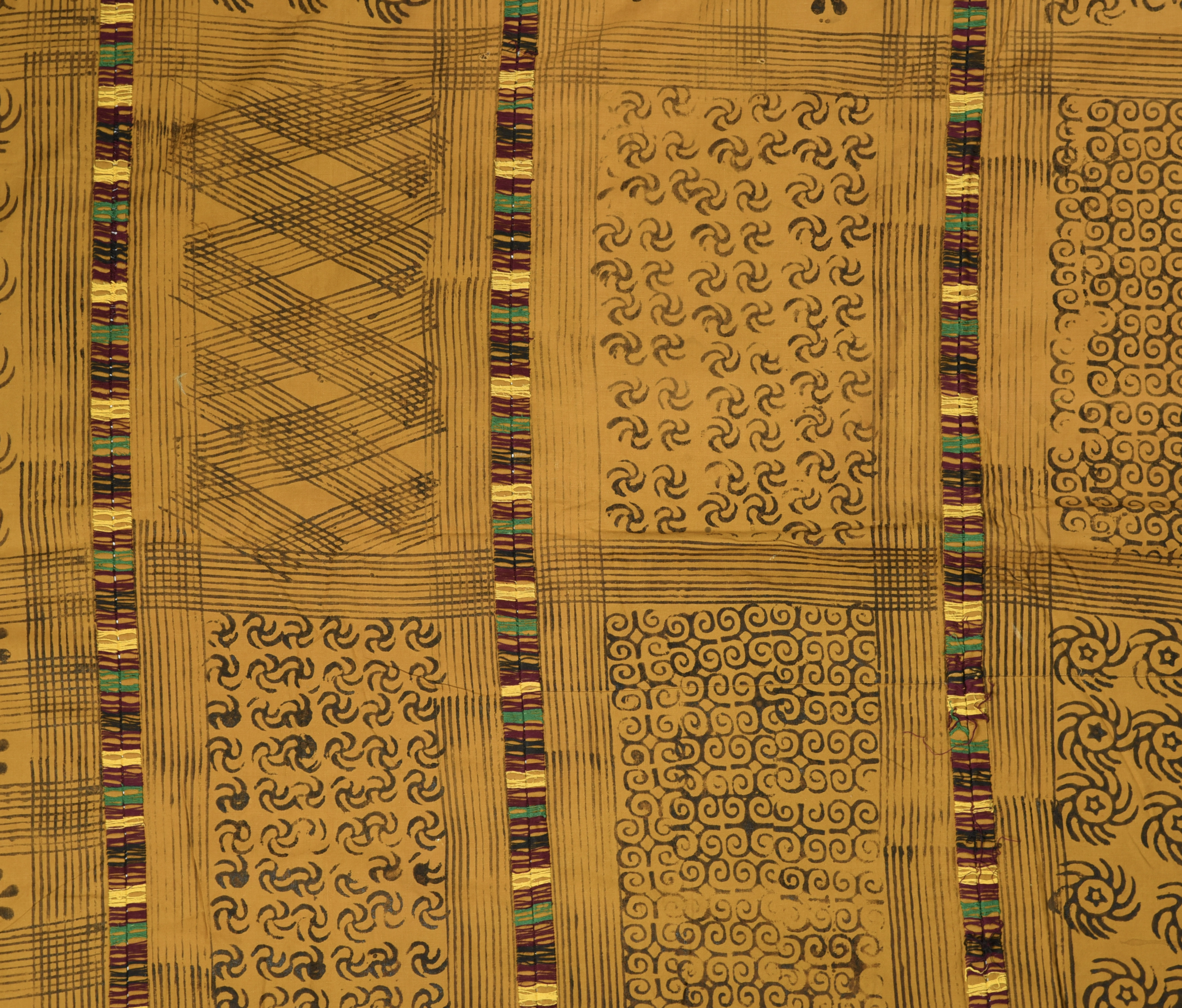 cotton, divided by stencil decorated panels of differing symbols, stitched together with yellow, red, black and green cotton,