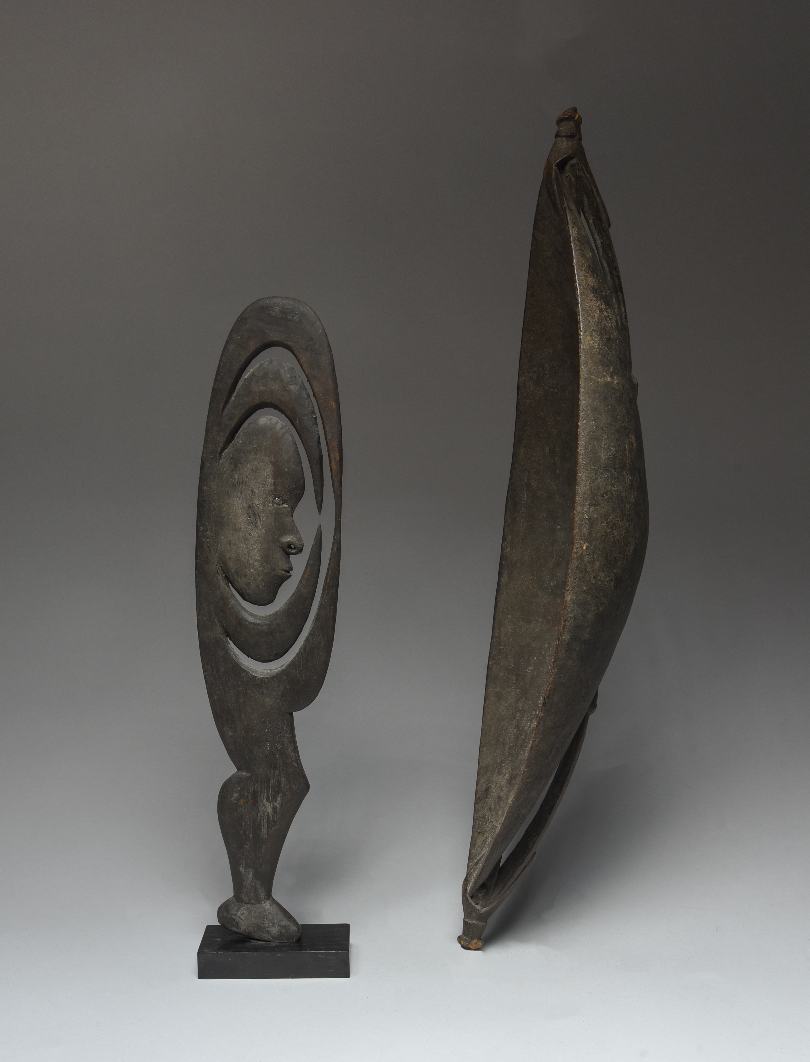 and a Karawari River hunting charm, yipwon, 42cm high, on a base. (2)