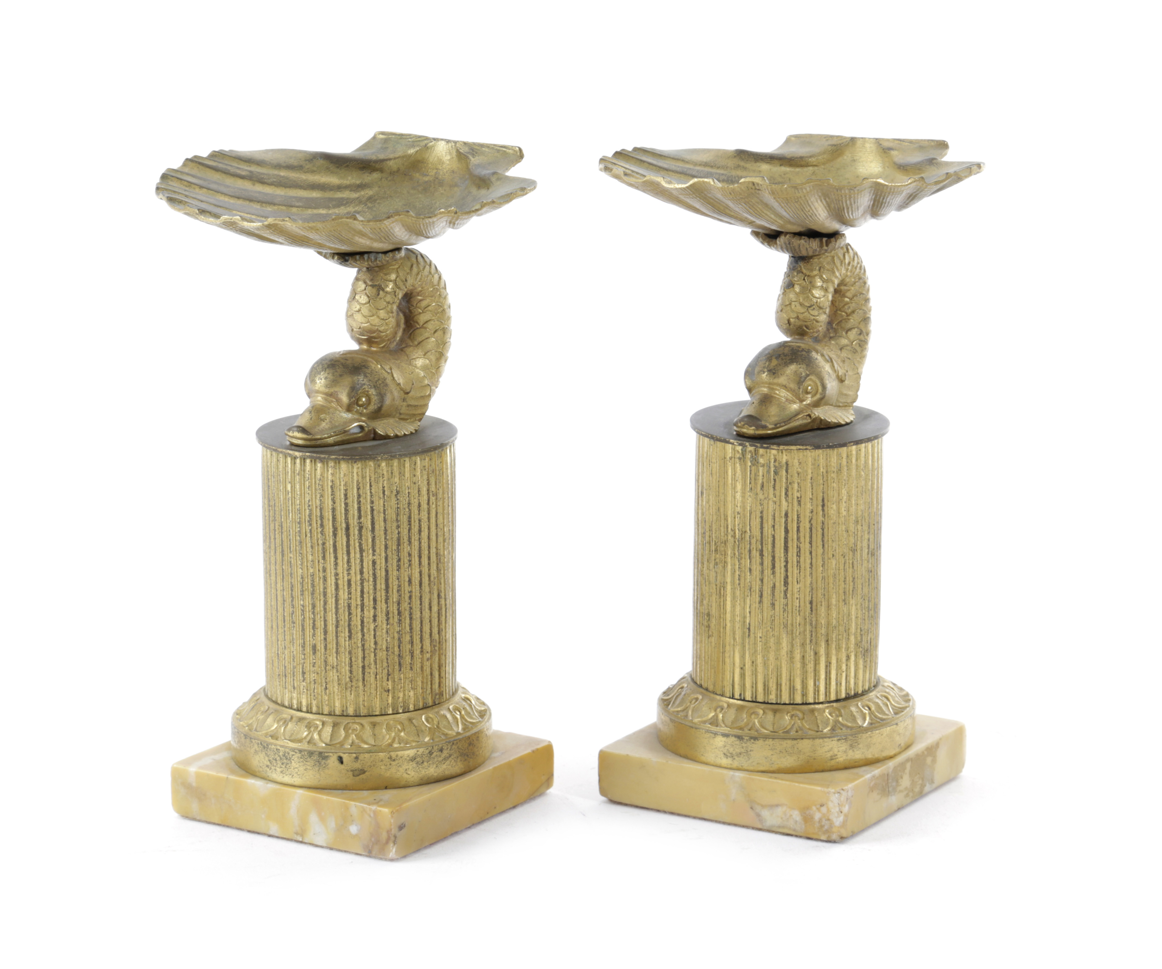 each in the form of a dolphin supporting a shell, on a reeded column and a Siena marble base (2)