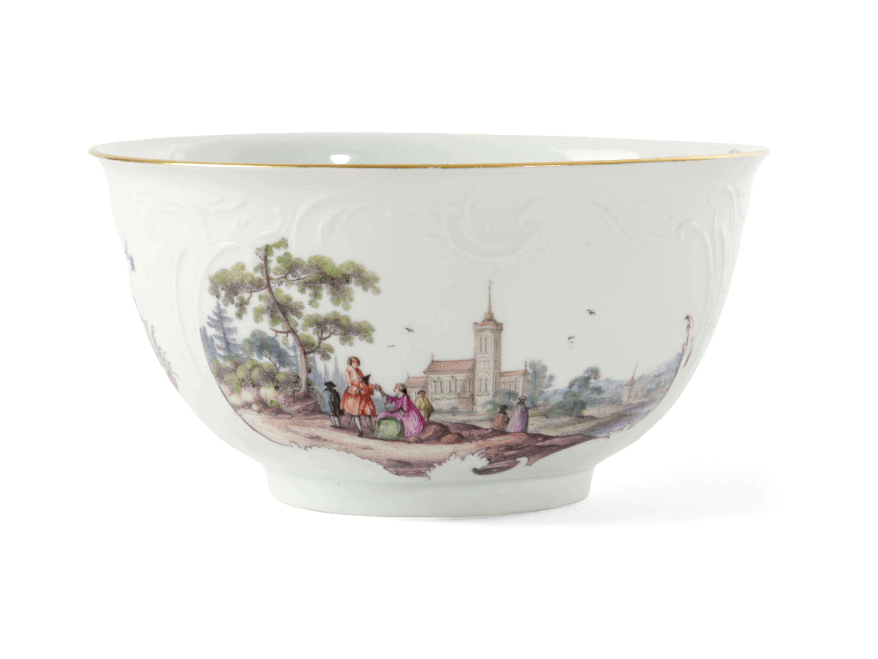 with moulded Rococo decoration and painted with figures in landscape scenes and with floral sprays, with an underglazed blue crossed swords mark
