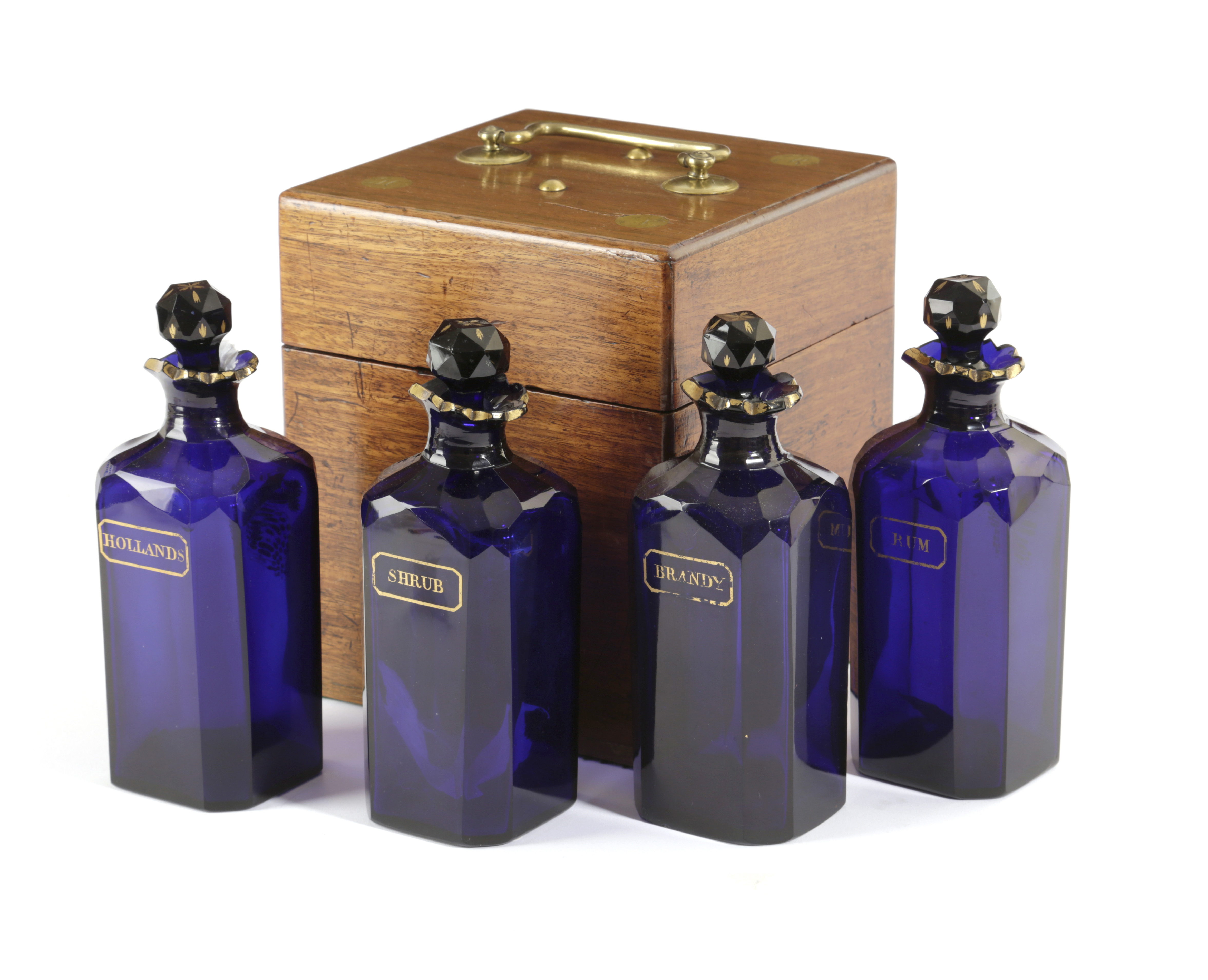 the hinged lid with a brass handle and inset with four circular plaques engraved with initials 'B R H S', the interior with four divisions fitted with Bristol blue glass decanters and stoppers with gilt highlights and named 'Brandy, Rum, Hollands, Shrub', with a dipped centre to hold a stopper when the decanter is in use, one with a Mallett Antiques price label for £2,950