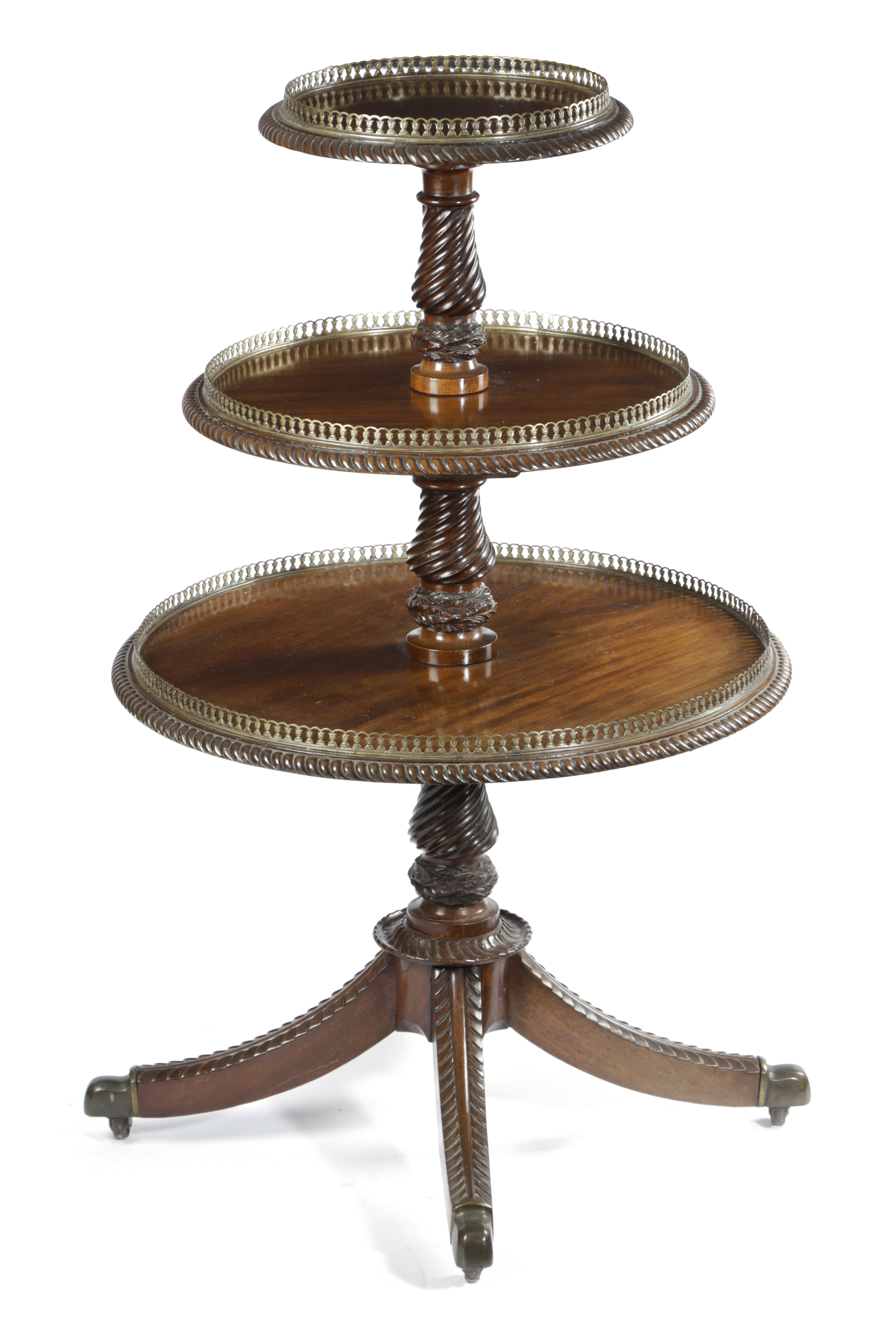 with three graduated revolving tiers, each with a brass gallery and gadrooned mouldings, the spiral fluted stem decorated with wreaths on foliate carved legs and brass castors
