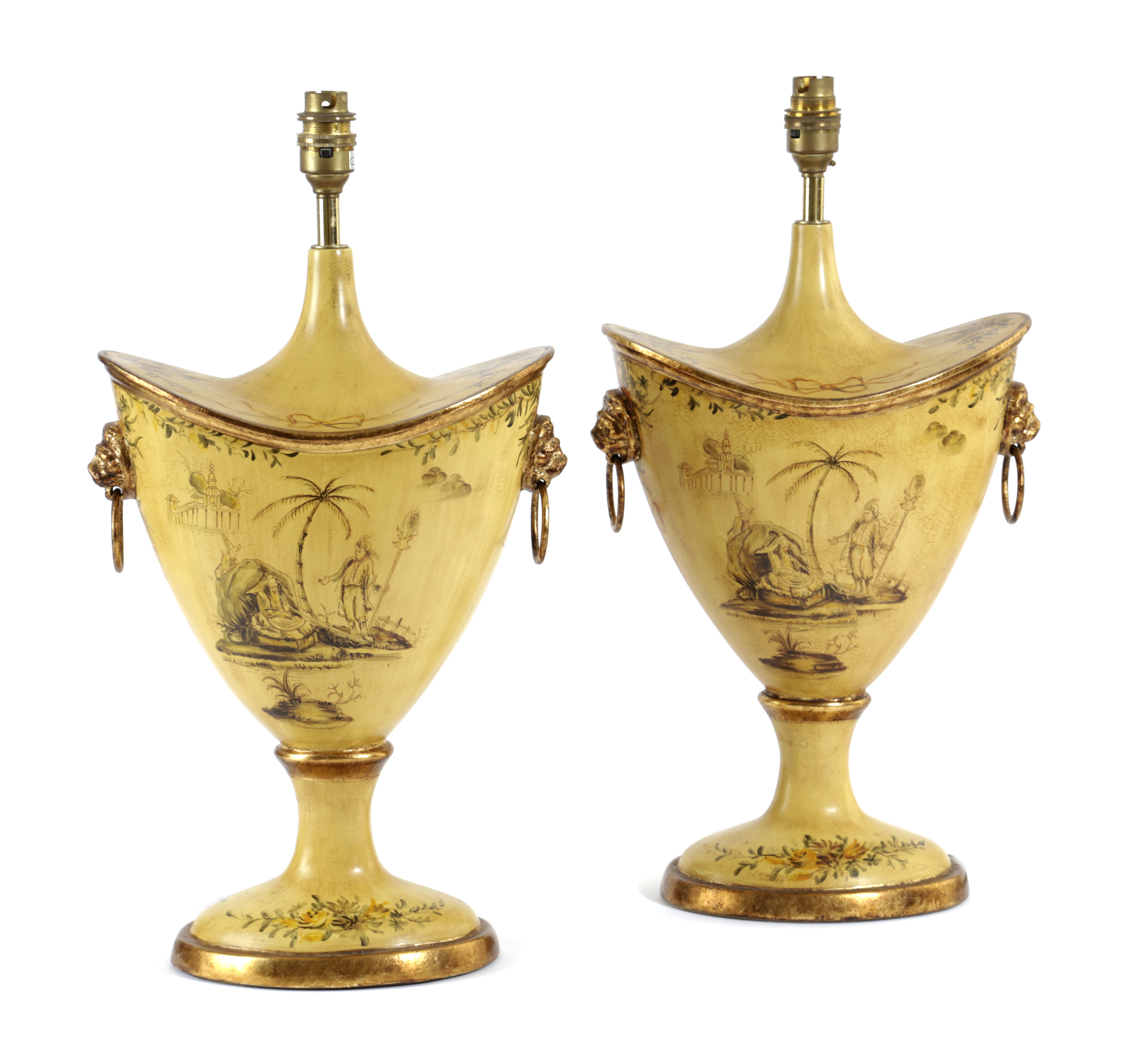 A PAIR OF TABLE LAMPS IN THE FORM OF 'TÔLE PEINTE' CHESTNUT URNS