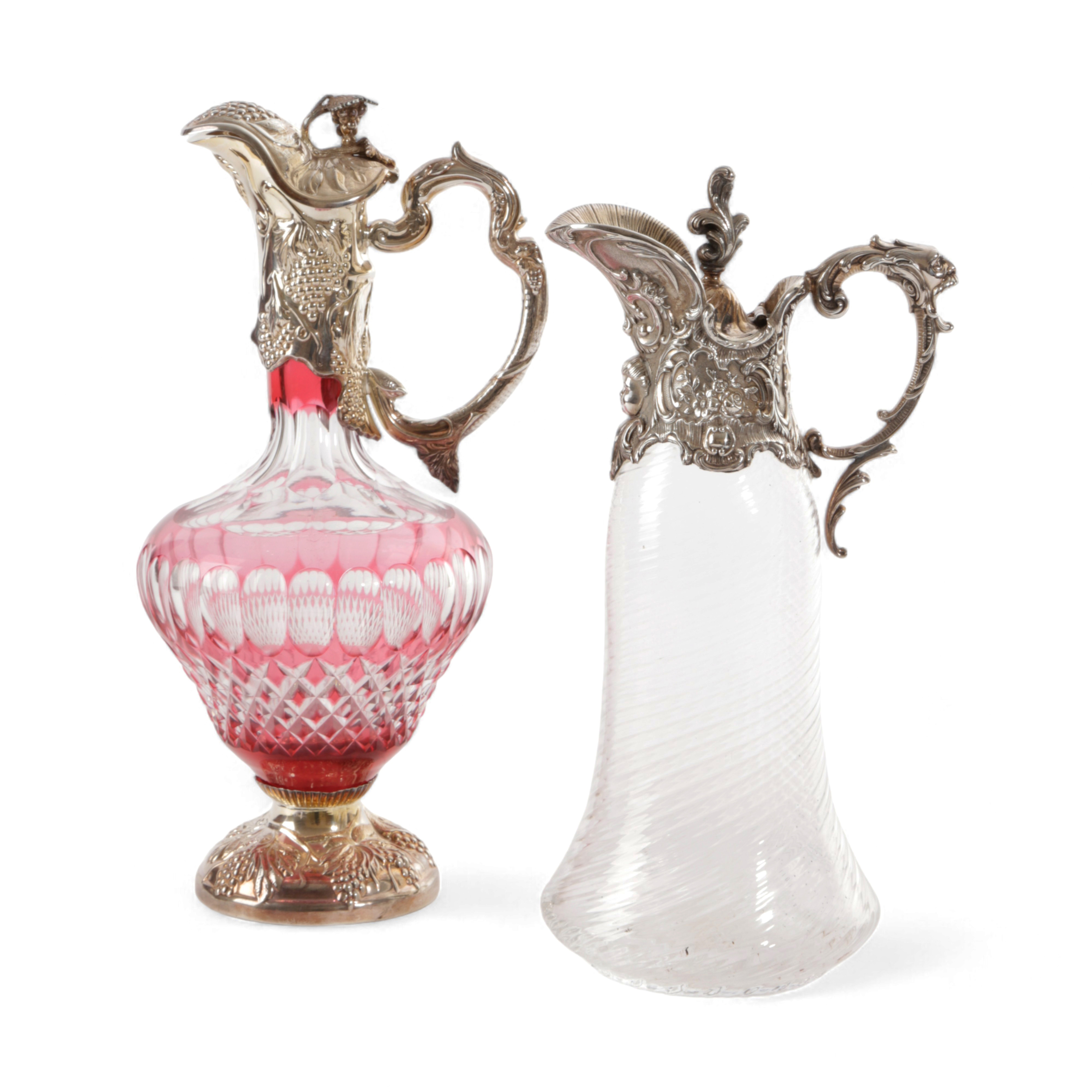 decorated with a grapevine and with a cut glass body, hallmarked for London 1978, together with a Portuguese silver mounted claret jug hallmarked for 2000 with a spiral fluted body (2)