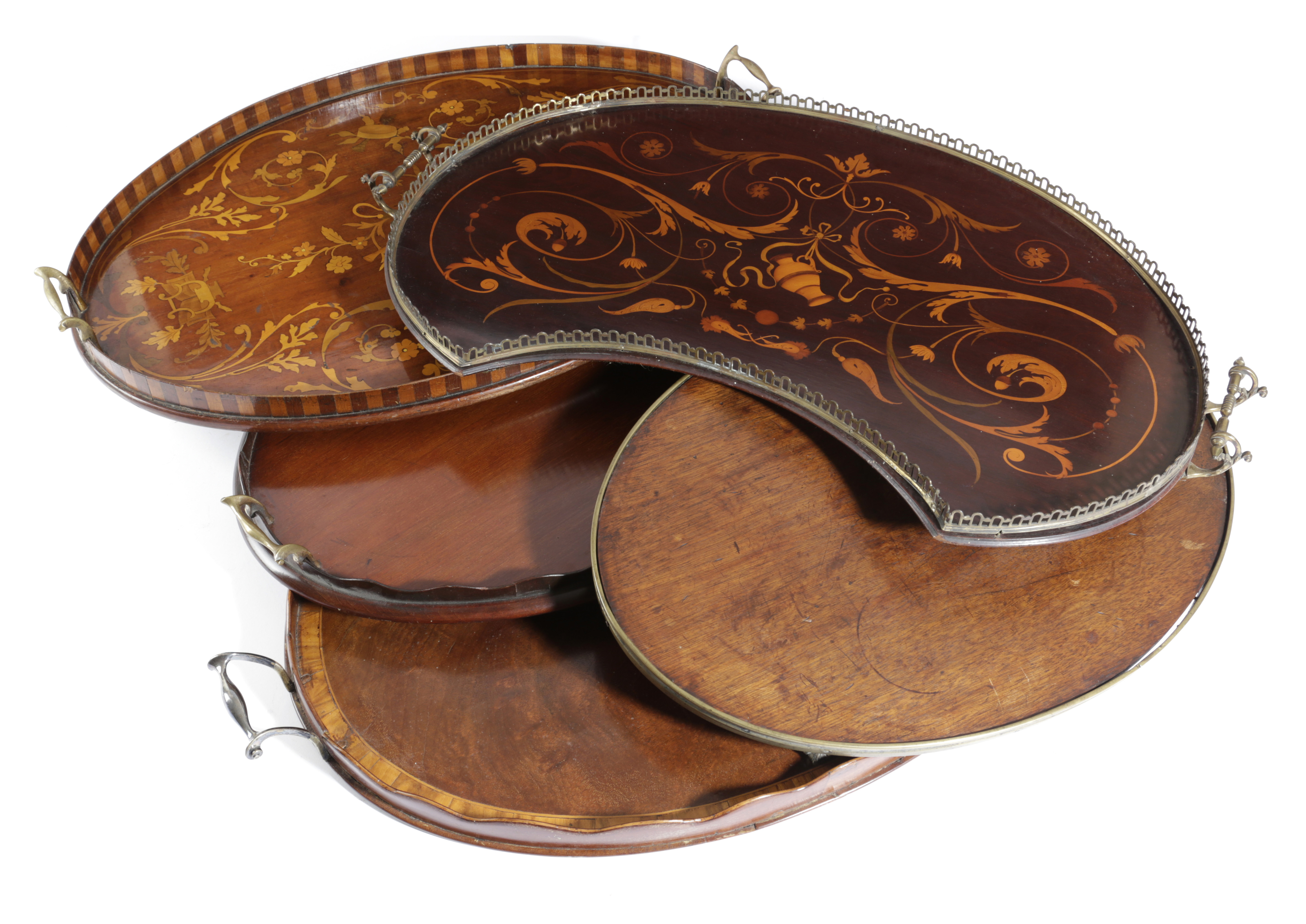 including: a George III mahogany and satinwood banded example, with a wavy edge laminated gallery inlaid with boxwood stringing and with plated handles and two late Victorian marquetry trays (5)