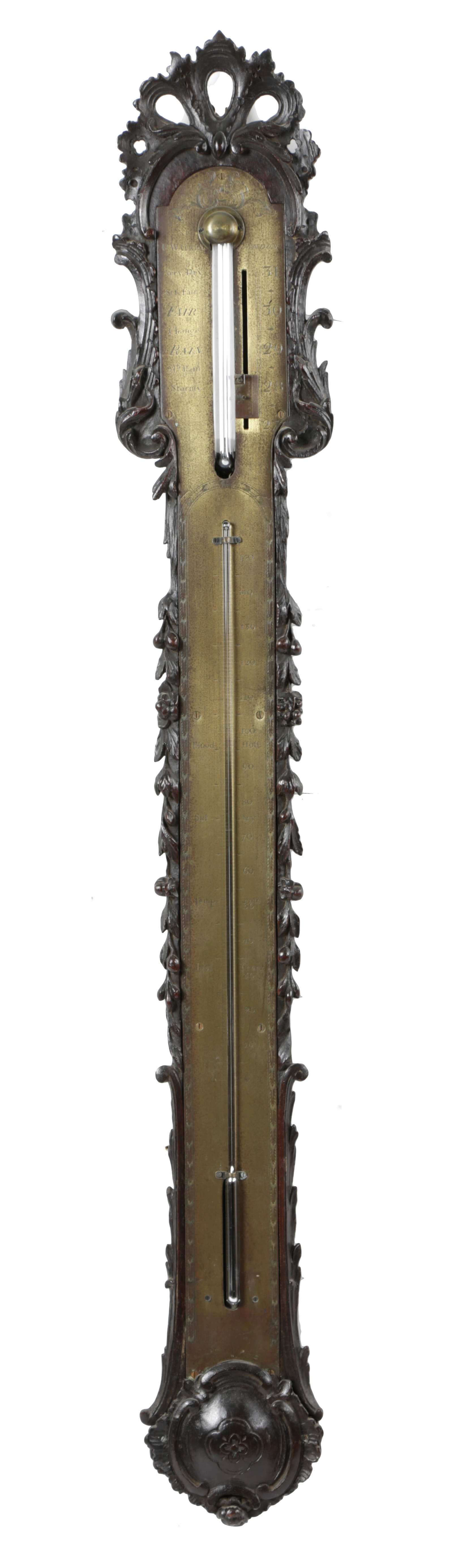 the brass dial with engraved decoration with vernier scale, above a thermometer, signed 'F. Watkins, London', the case carved with leaves, scrolls and with side garlands of fruit and leaves, with a pierced cartouche surmount