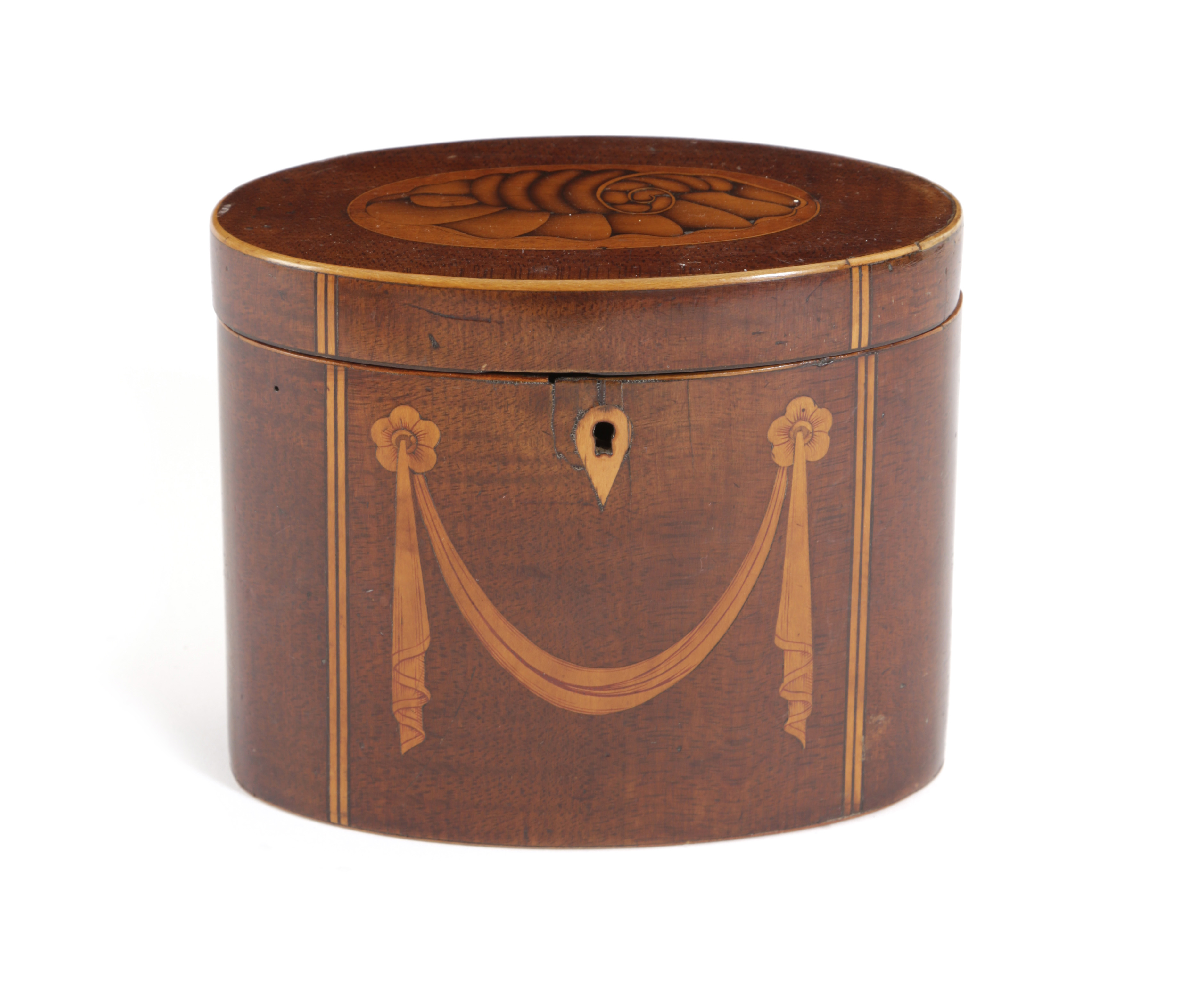 A GEORGE III HAREWOOD OVAL TEA CADDY
