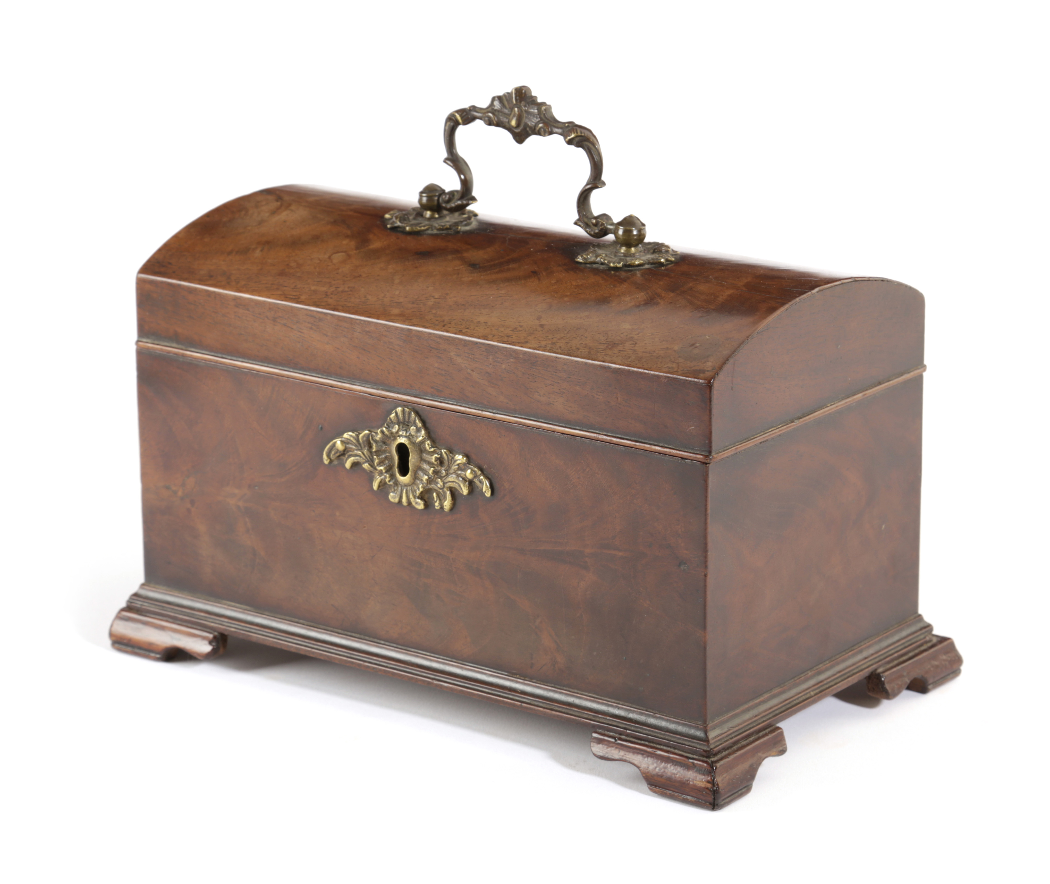 the domed lid revealing three divisions, with a gilt brass Rococo handle and escutcheon