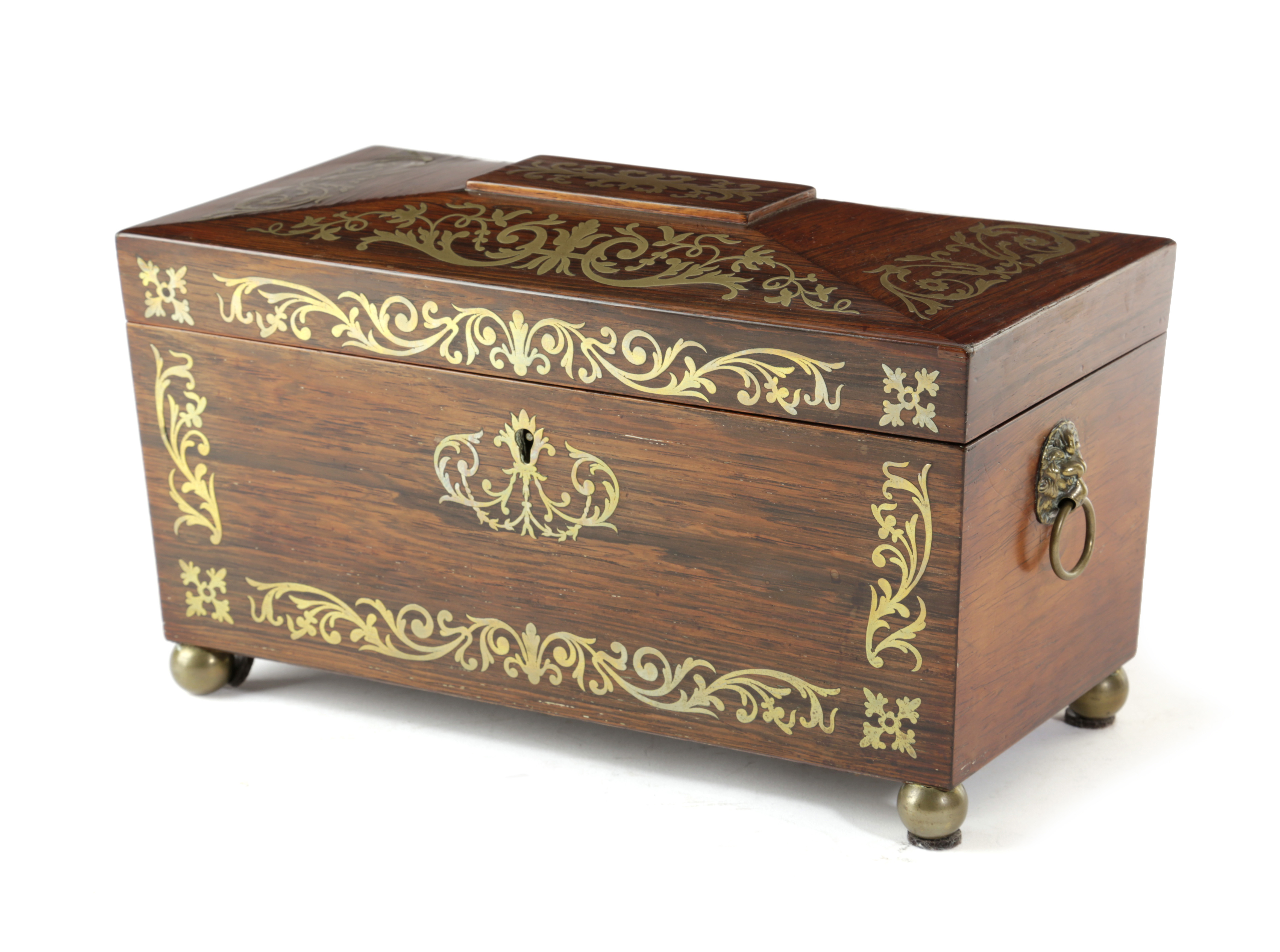 λ A GEORGE IV ROSEWOOD AND BRASS MARQUETRY TEA CHEST