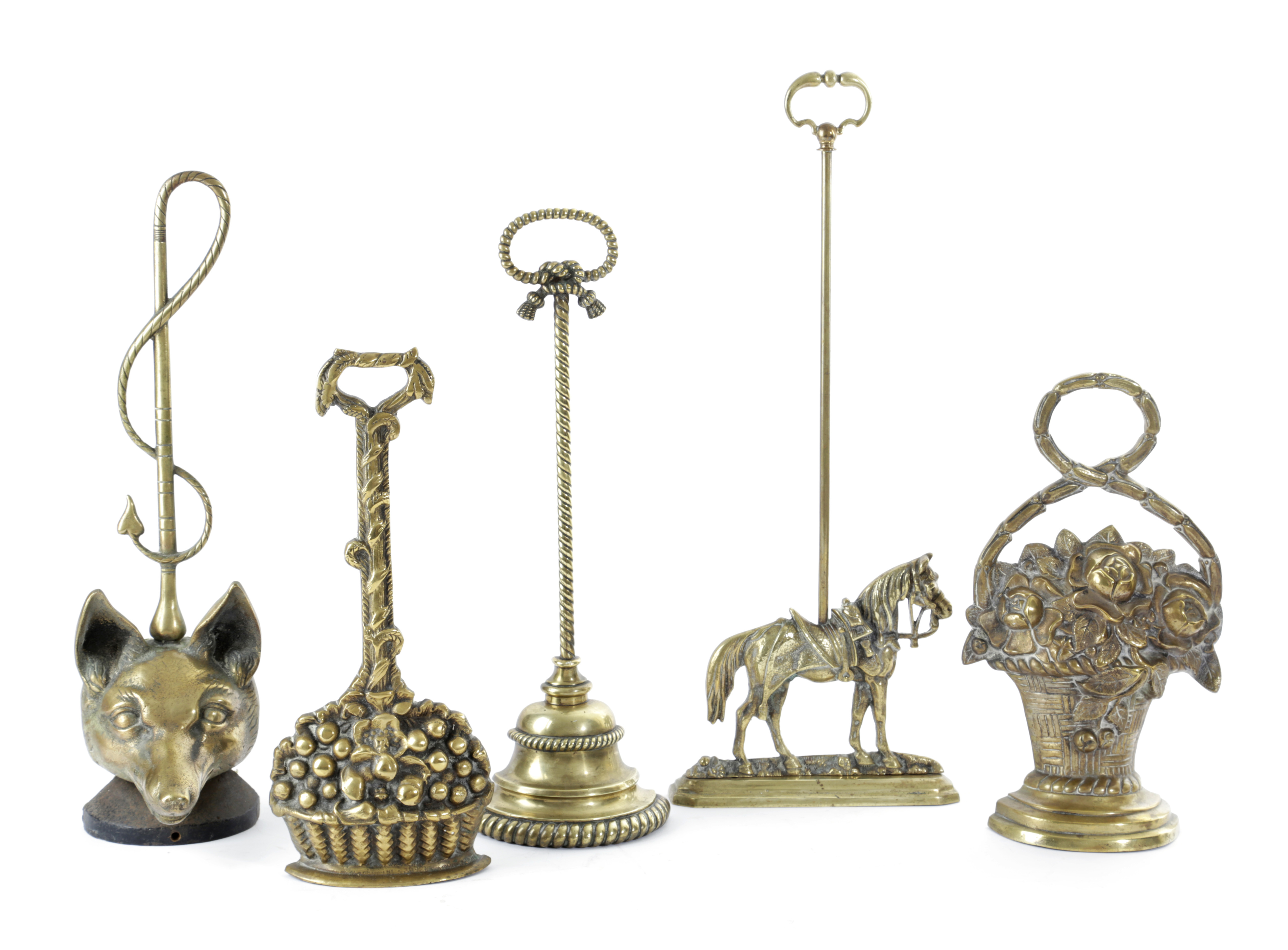 comprising: a bell shaped expample with nulled decoration and a rope-twist handle the cast weight indistinctly stamped with numbers, together with two in the form of a basket of flowers, a fox's head doorstop the handle in the form of a riding whip and a horse example, stamped 'Registered For' (5)