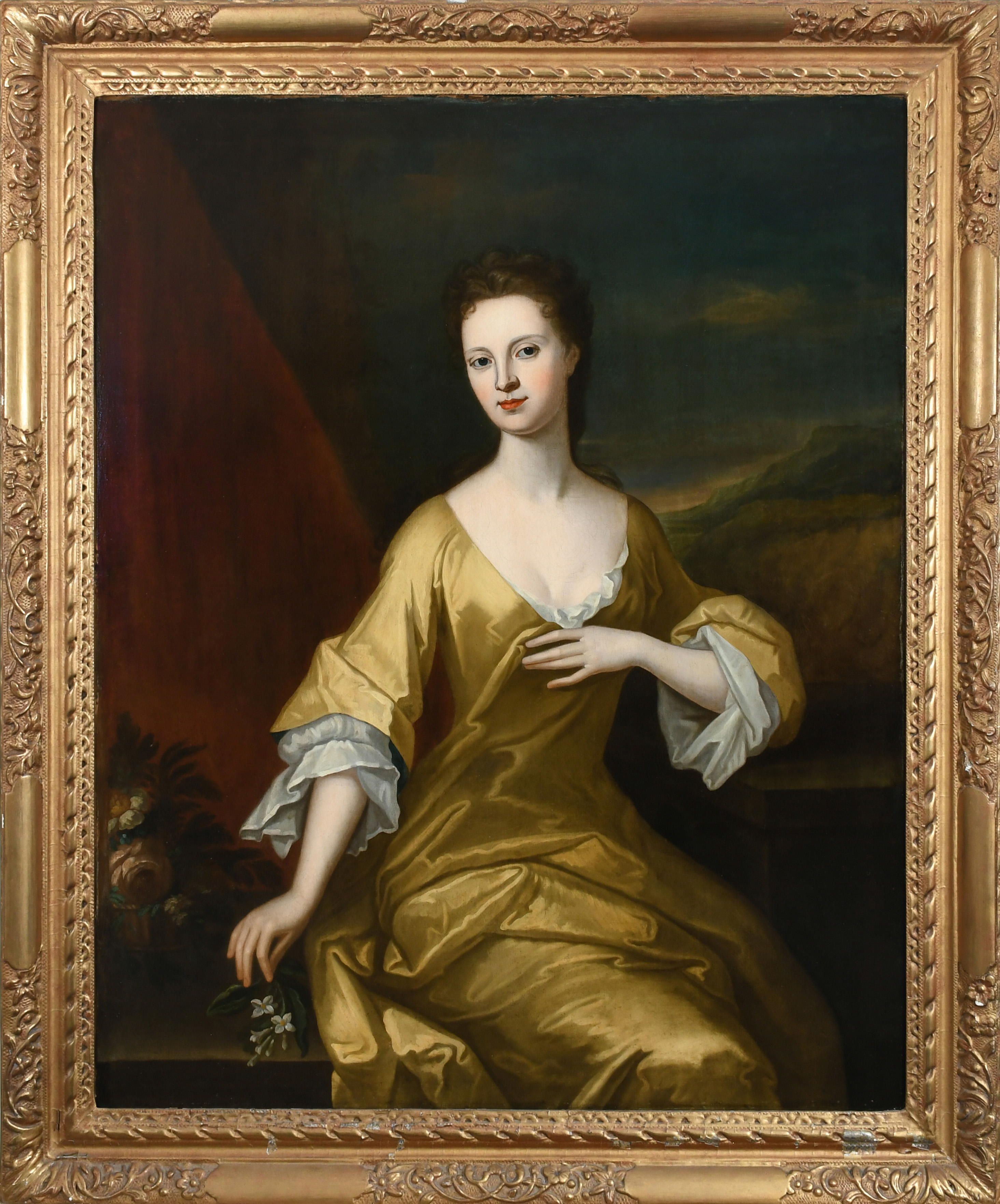 Portrait of a lady, traditionally identified as Lady Helen Livingston, Countess of Kilmarnock, three-quarter length, wearing a yellow dress, with a landscape beyond