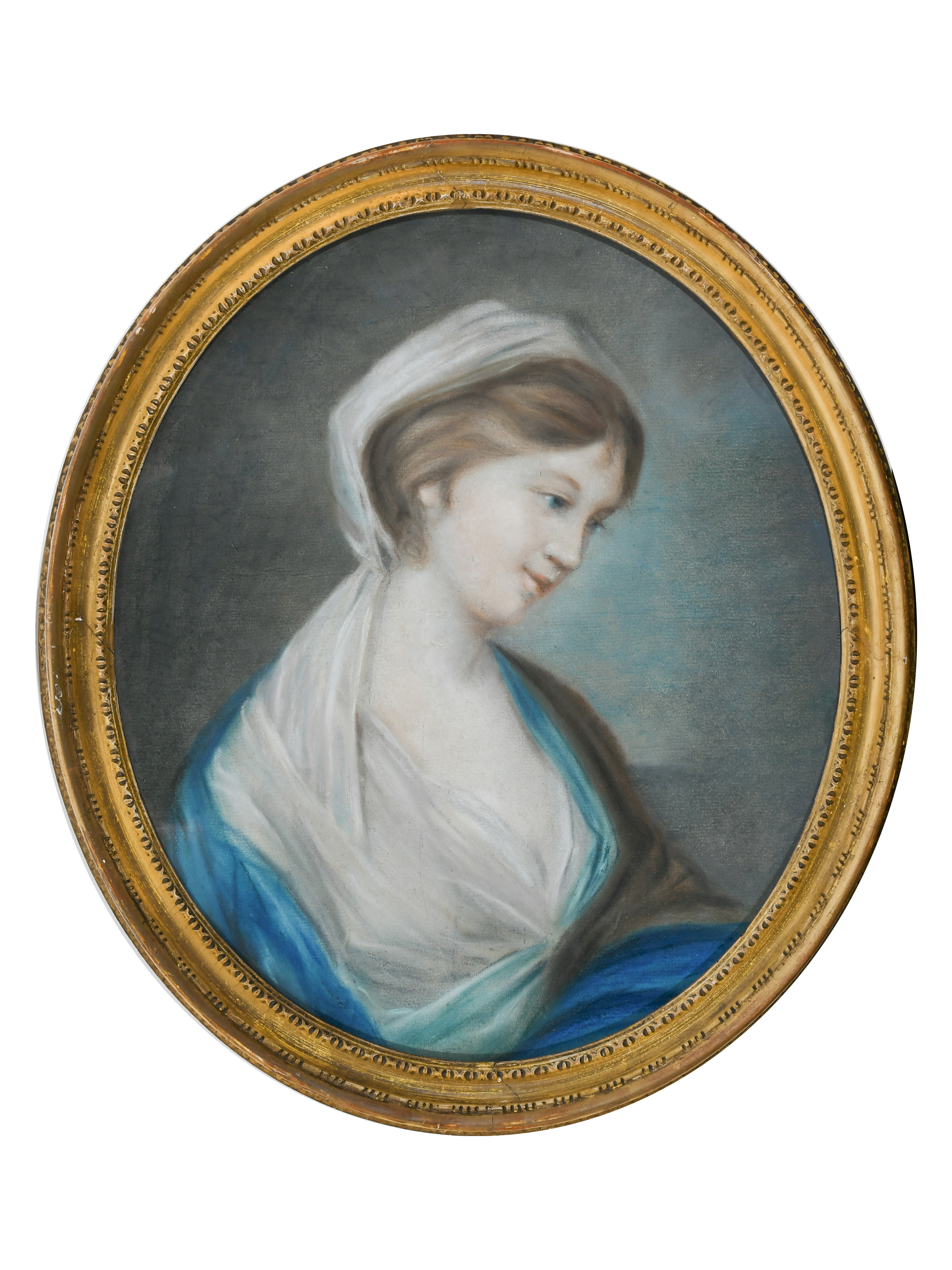 Portrait of a young lady wearing a white dress and blue fur-lined cloak