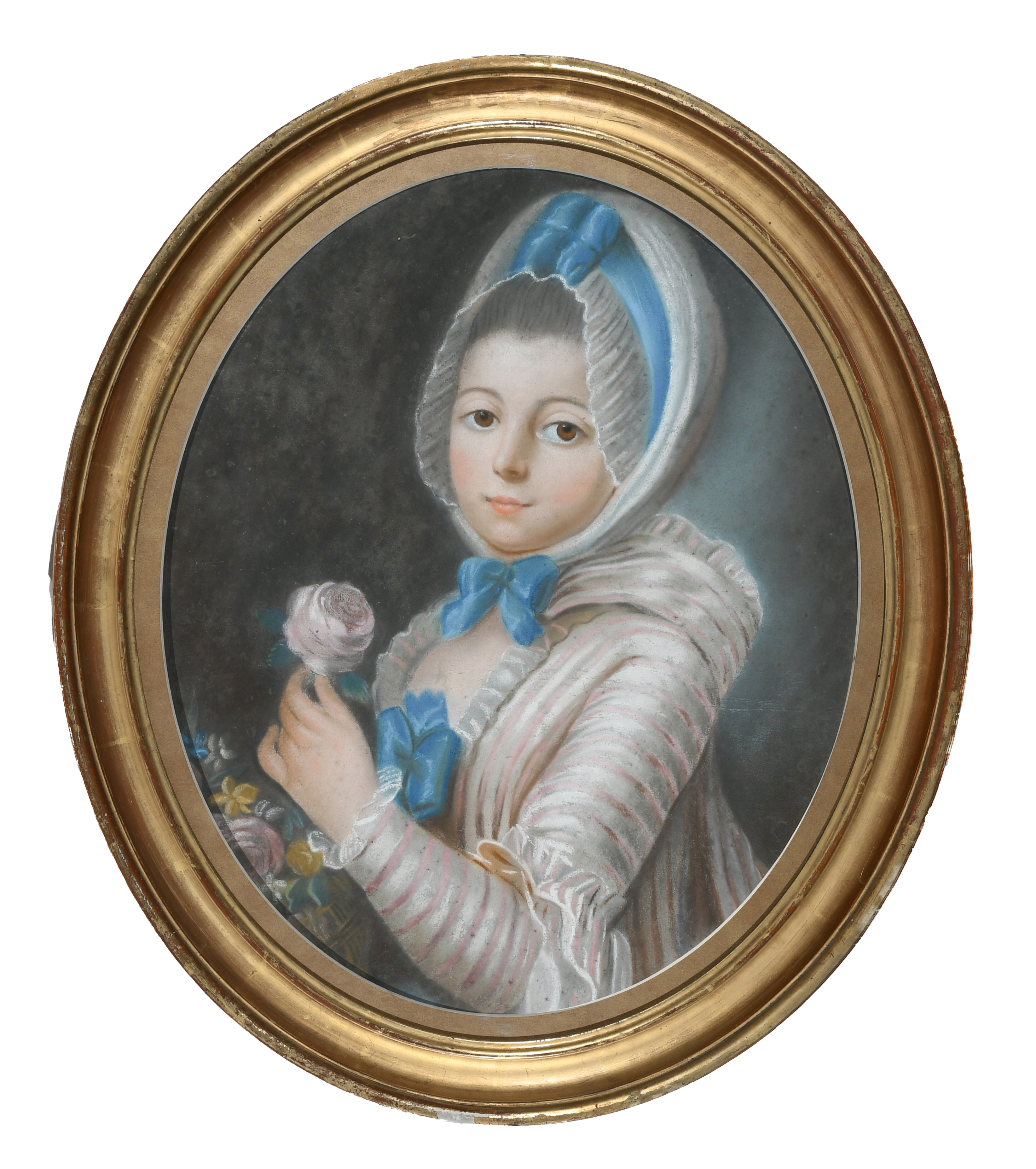 Portrait of a girl wearing a striped dress and a bonnet with a blue ribbon