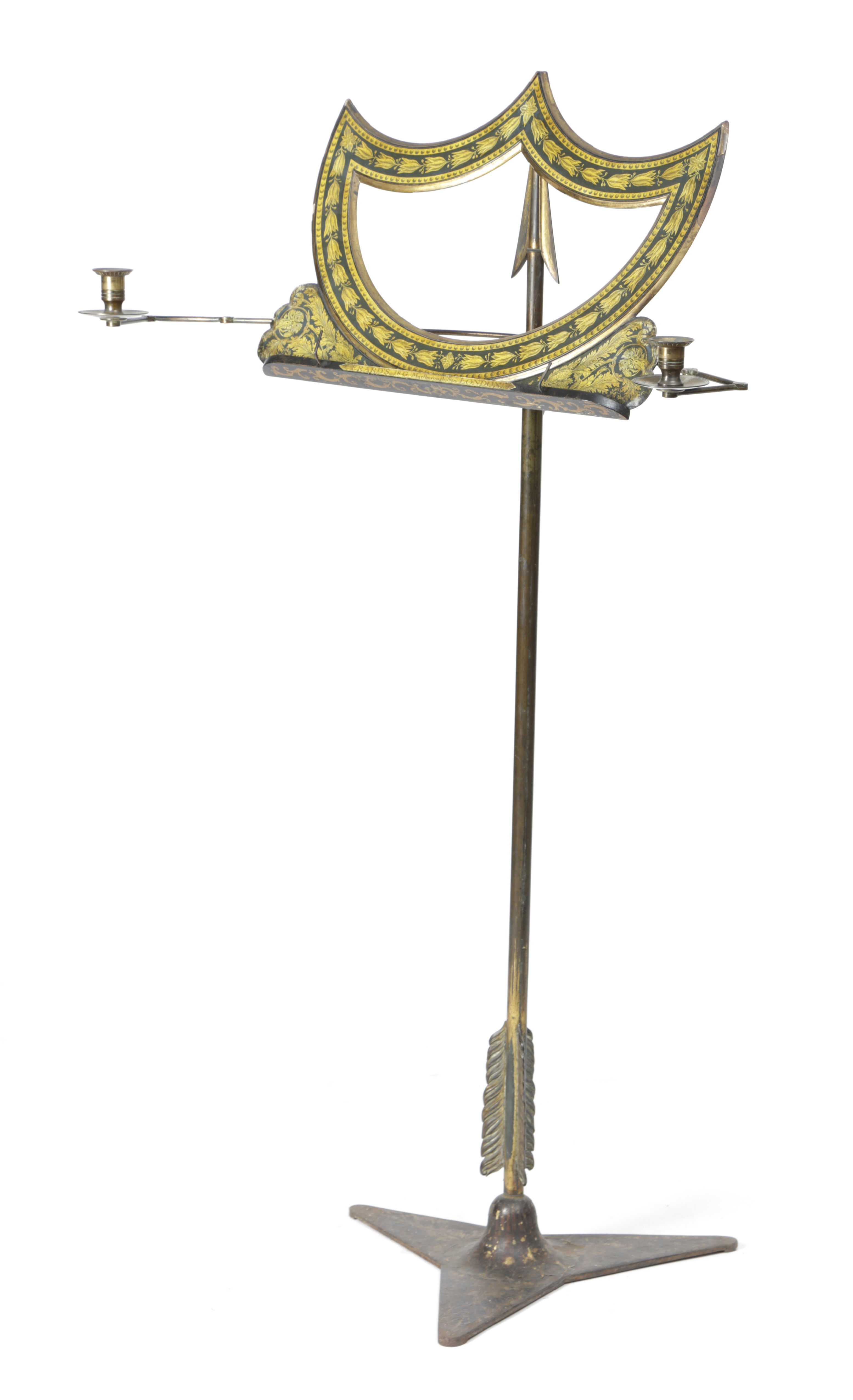 the lyre shape rest decorated with bands of beads and harebells and with scrolling leaves, inscribed 'Erard's, 18 Gt. Marlborough Str. London', with a pair of extending candle sconces, on an adjustable arrow shaft and foliate decorated triform base