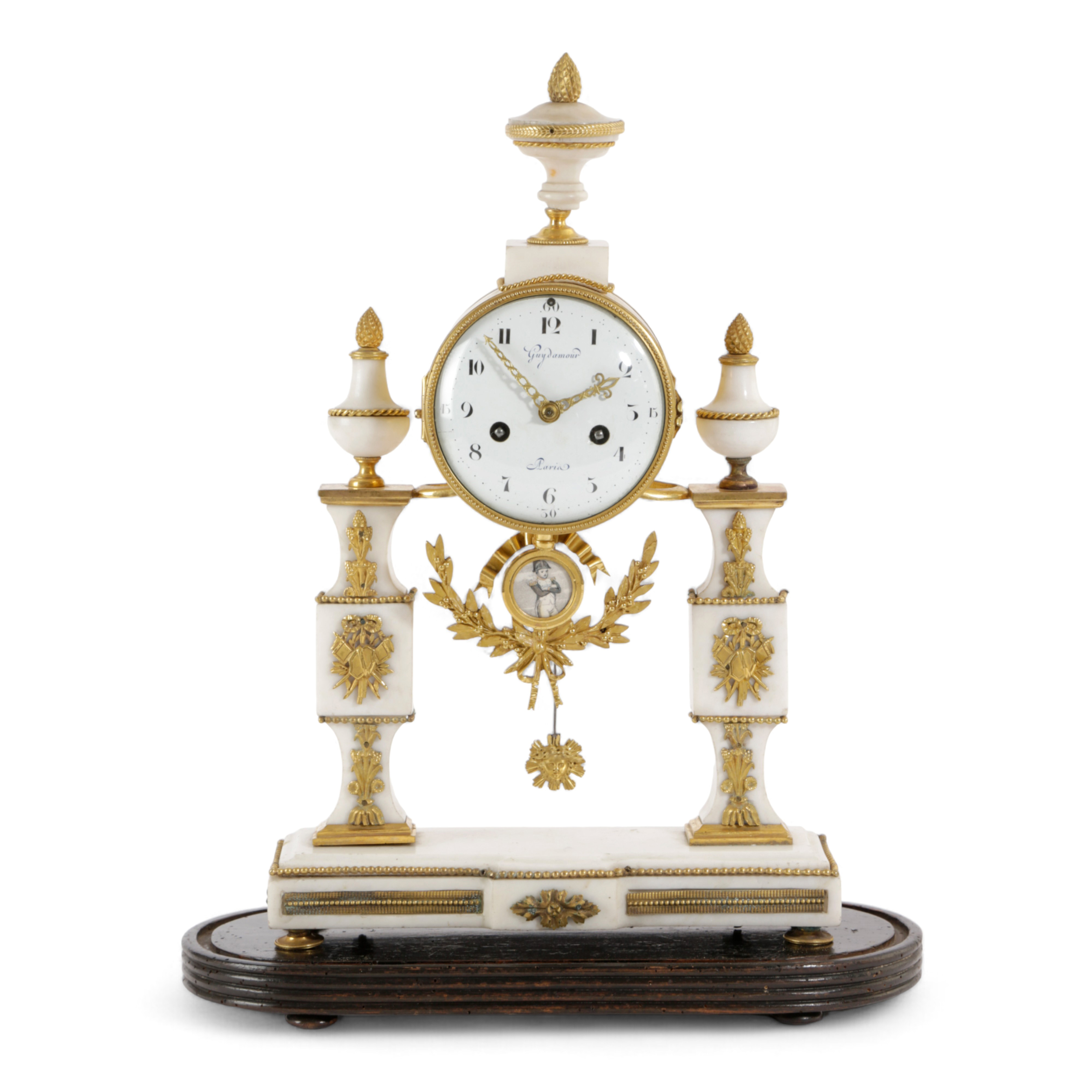 A FRENCH DIRECTOIRE MARBLE AND ORMOLU PORTICO CLOCK