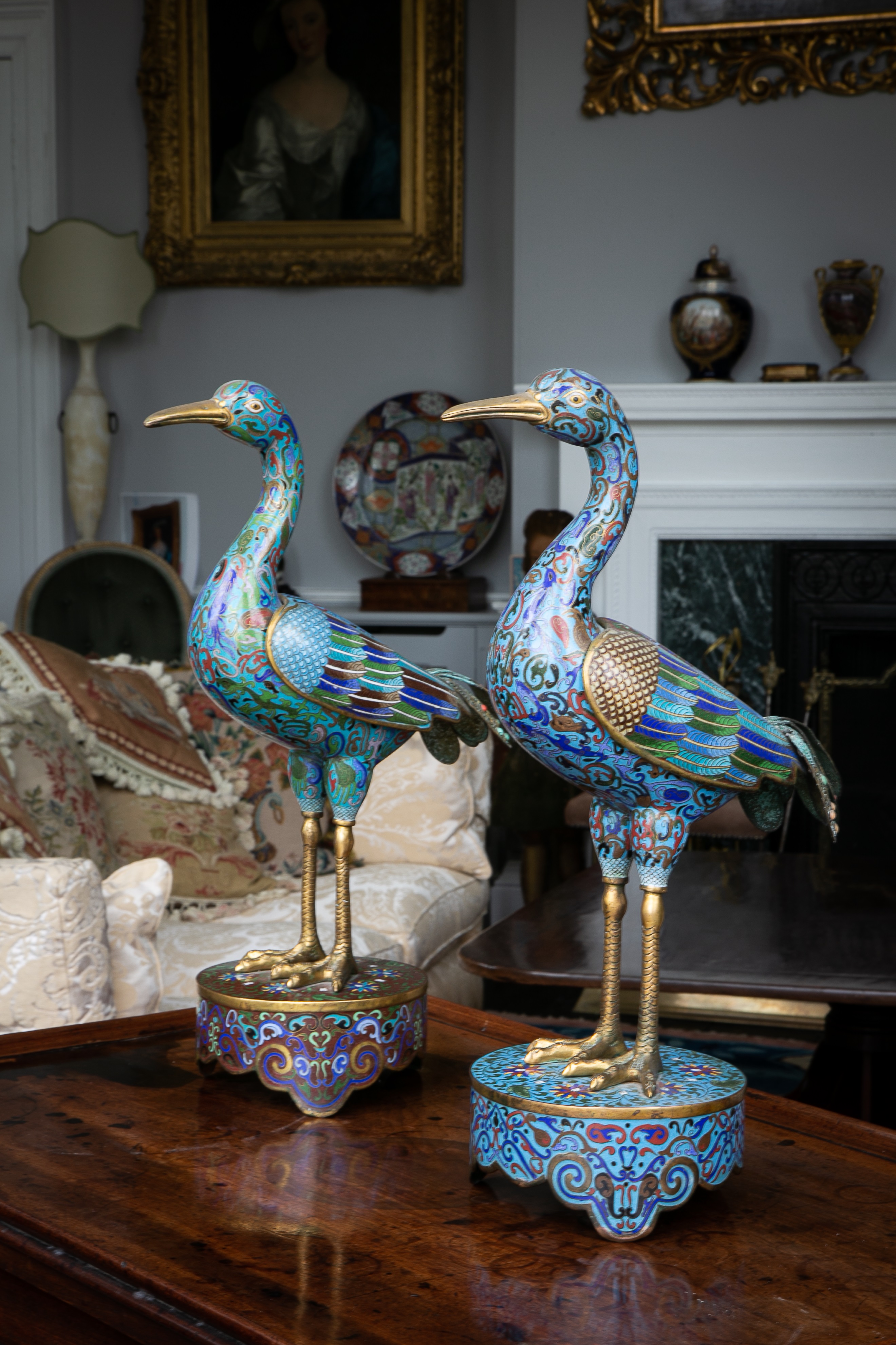 λ A MATCHED PAIR OF CHINESE CLOISONNÉ INCENSE BURNERS MODELLED AS CRANES