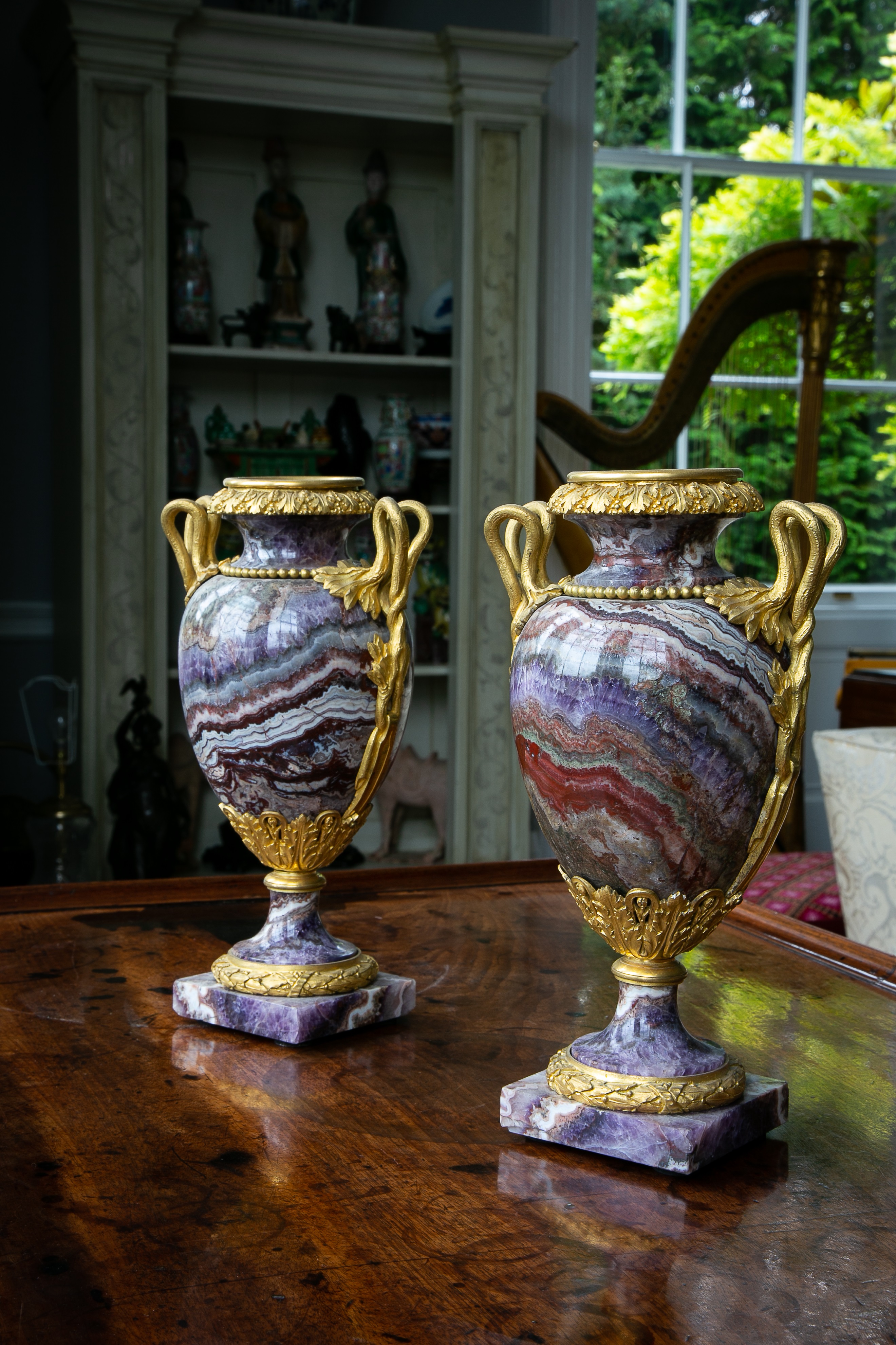 A RARE PAIR OF FRENCH EMPIRE AMETHYST QUARTZ AND ORMOLU MOUNTED NEO-CLASSICAL URNS
