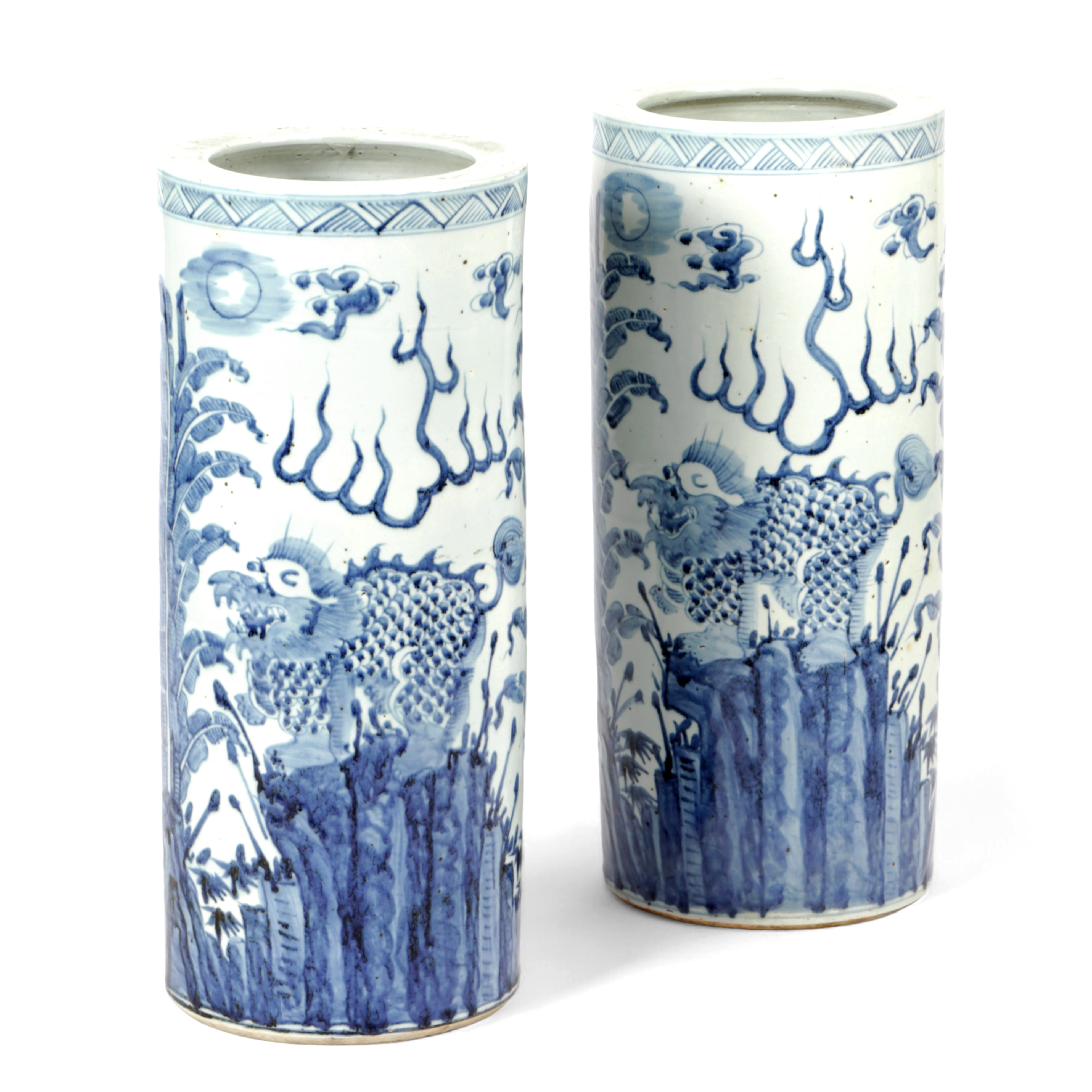 A PAIR OF CHINESE BLUE AND WHITE PORCELAIN STICKSTANDS