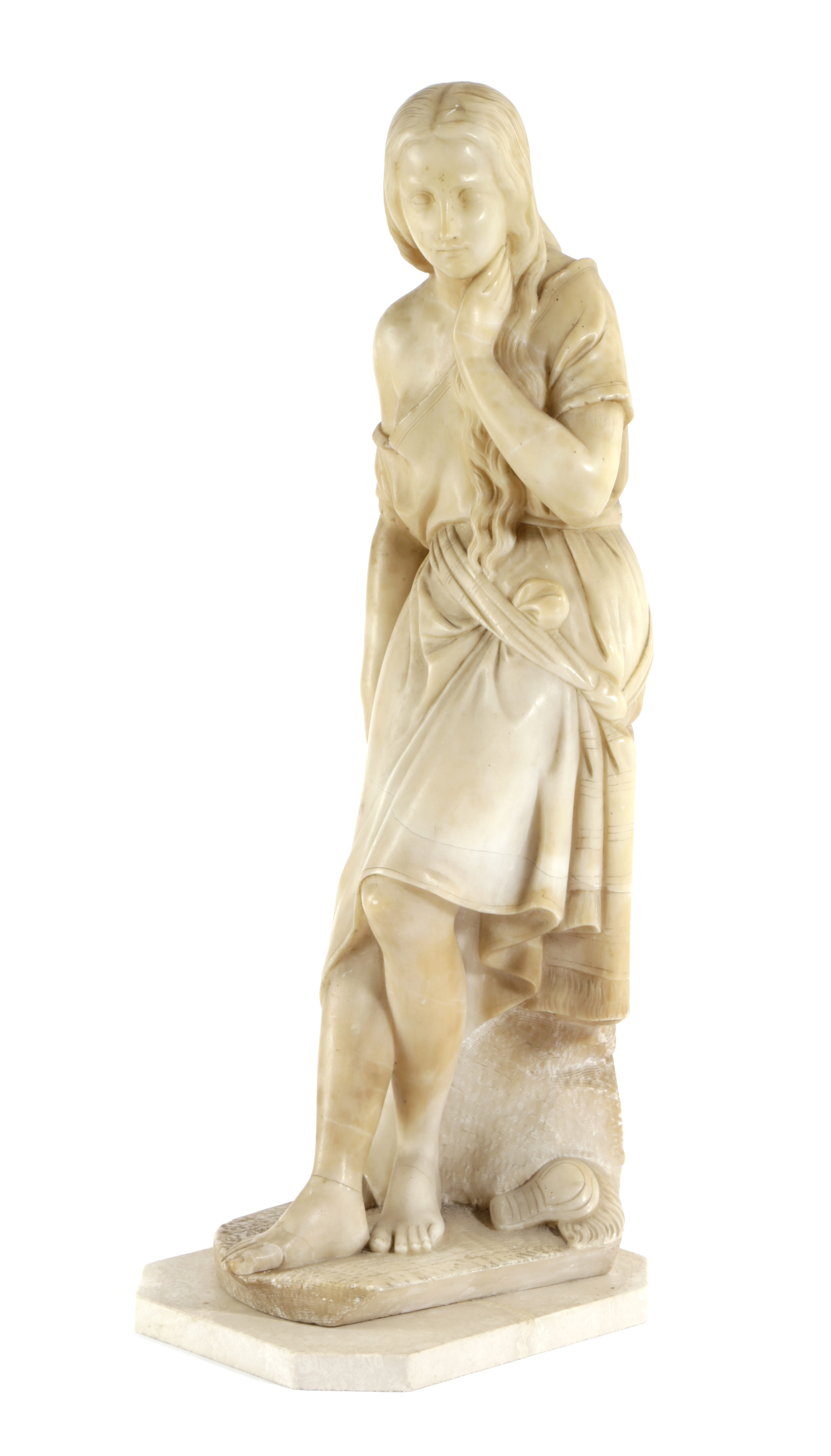 AN ITALIAN ALABASTER FIGURE OF A PENSIVE MAIDEN